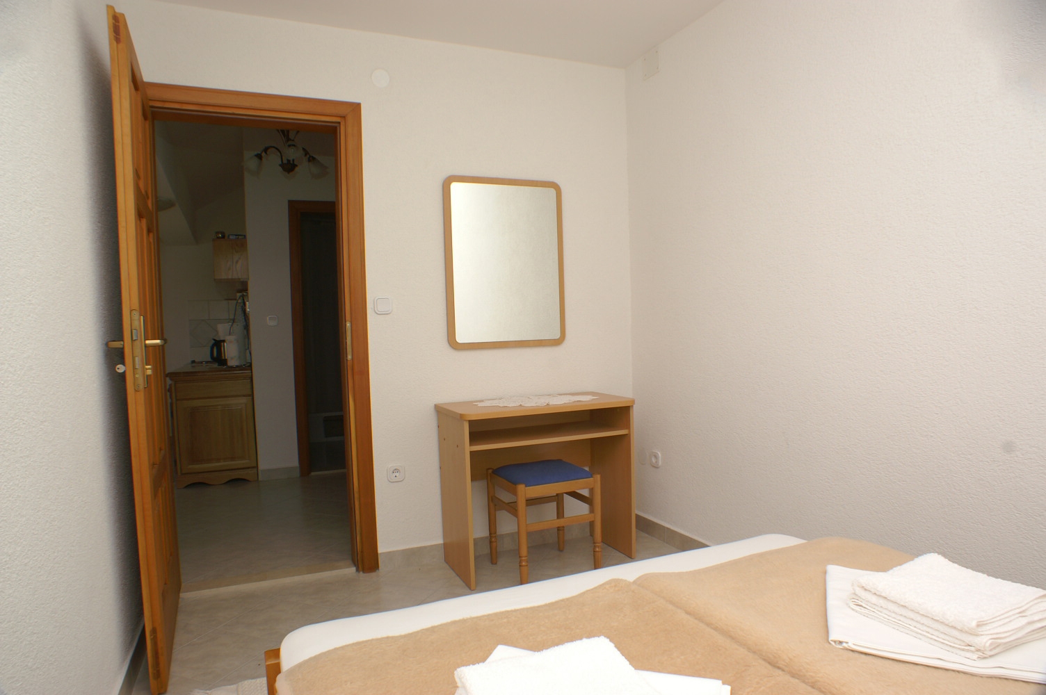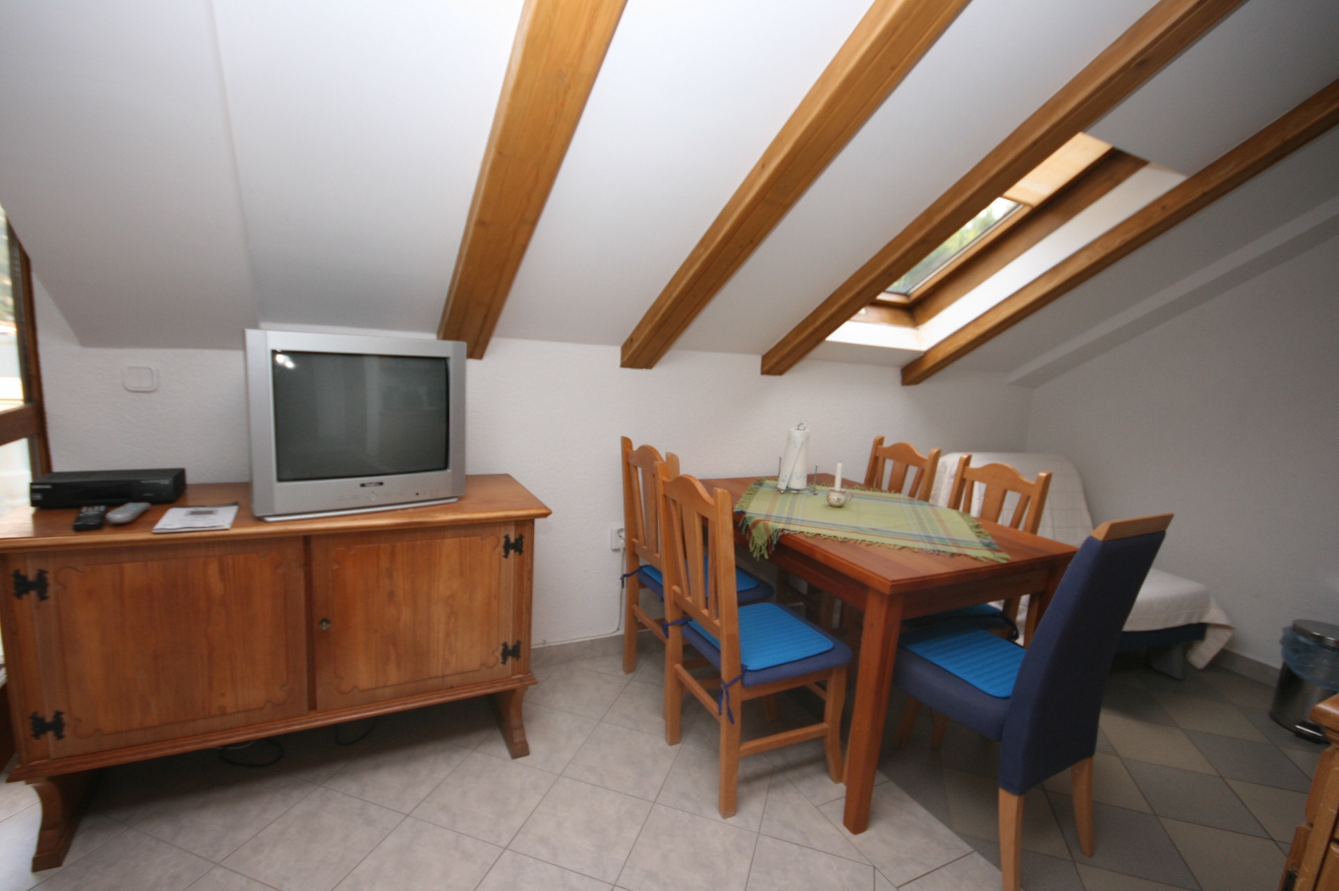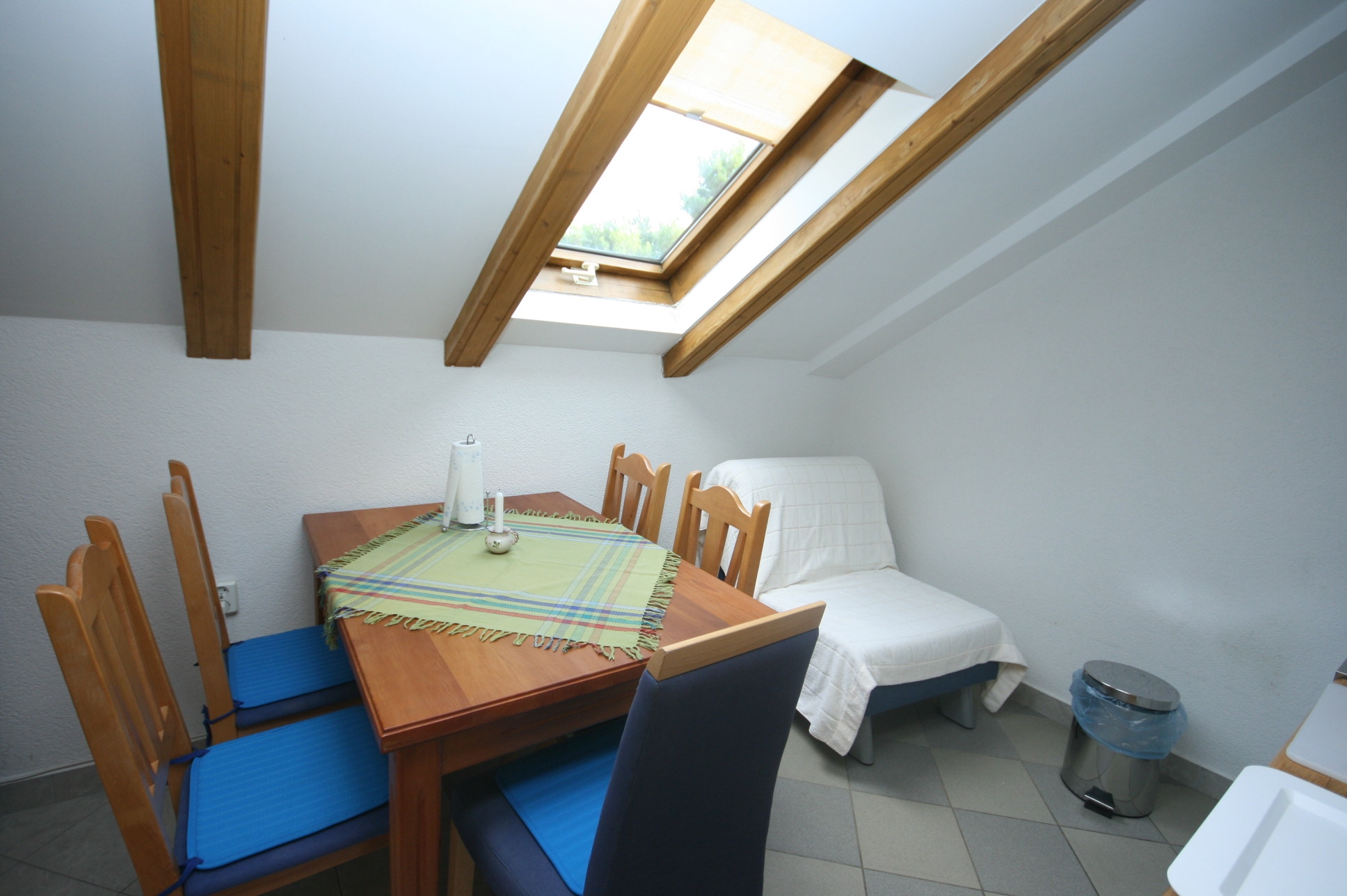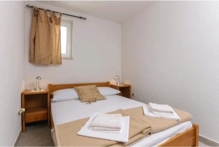 Apartament może przyjąć 5 gości. Łóżka znajdują się w sypialniach, których jest 1, oraz w pokoju dziennym i jadalni, na powierzchni 32m2. Goście mają dostęp do tarasu, by korzystać z ciepłych, letnich wieczorów. Z apartamentu roztacza się widok na morze. W kwaterze dozwolony jest pobyt zwierzęcia domowego, za dopłatą. WLICZONE W CENĘ: taksa pobytowa, sprzątanie końcowe, klimatyzacja, parking, internet, łóżeczko dziecięce, żelazko, deska do prasowania, suszarka do włosów. OBOWIĄZKOWE KOSZTY DODATKOWE: dopłata za krótki termin (procent dopłaty w zalezności od liczby noclegów: 30% - 1, 20% - 2, 10% - 3). NIEOBOWIĄZKOWE KOSZTY DODATKOWE: pranie bielizny (5,00 € pranie), miejsce do cumowania łodzi (3,00 € za nocleg), zwierzęta domowe (5,00 € za nocleg). Dostępność dodatkowych usług w rezerwowanym terminie oraz ich cenę (jeśli nie jest podana) należy sprawdzić wcześniej. Za dodatowe usługi, które nie zostały uwzględnione w kalkulacji ceny, płaci się bezpośrednio właścicielowi obiektu, pod warunkiem śe gość korzysta z tych usług.