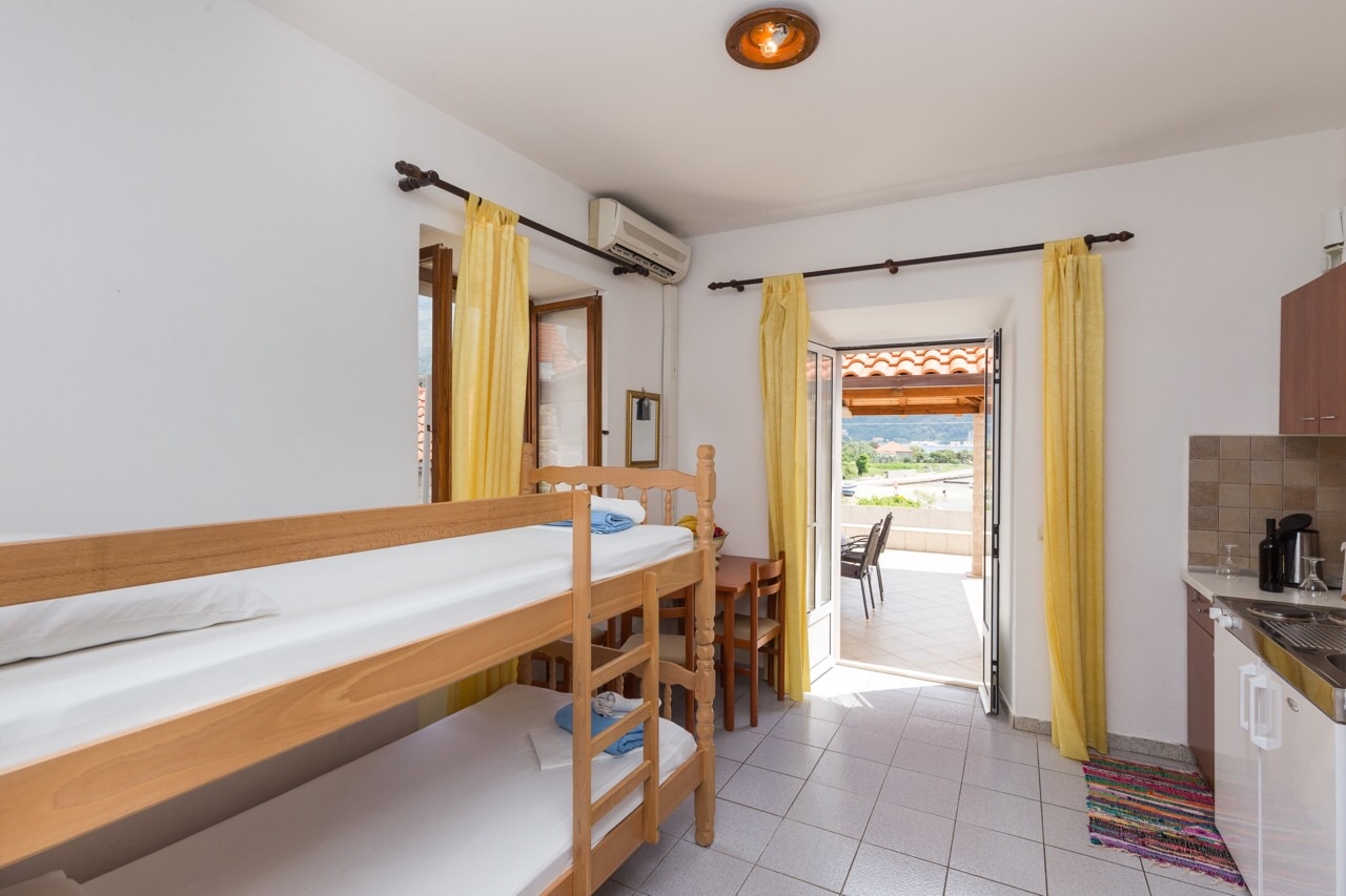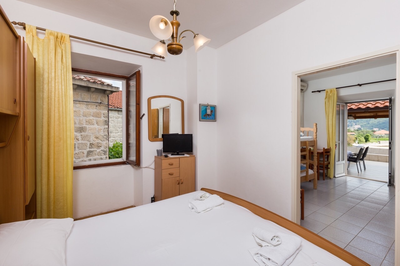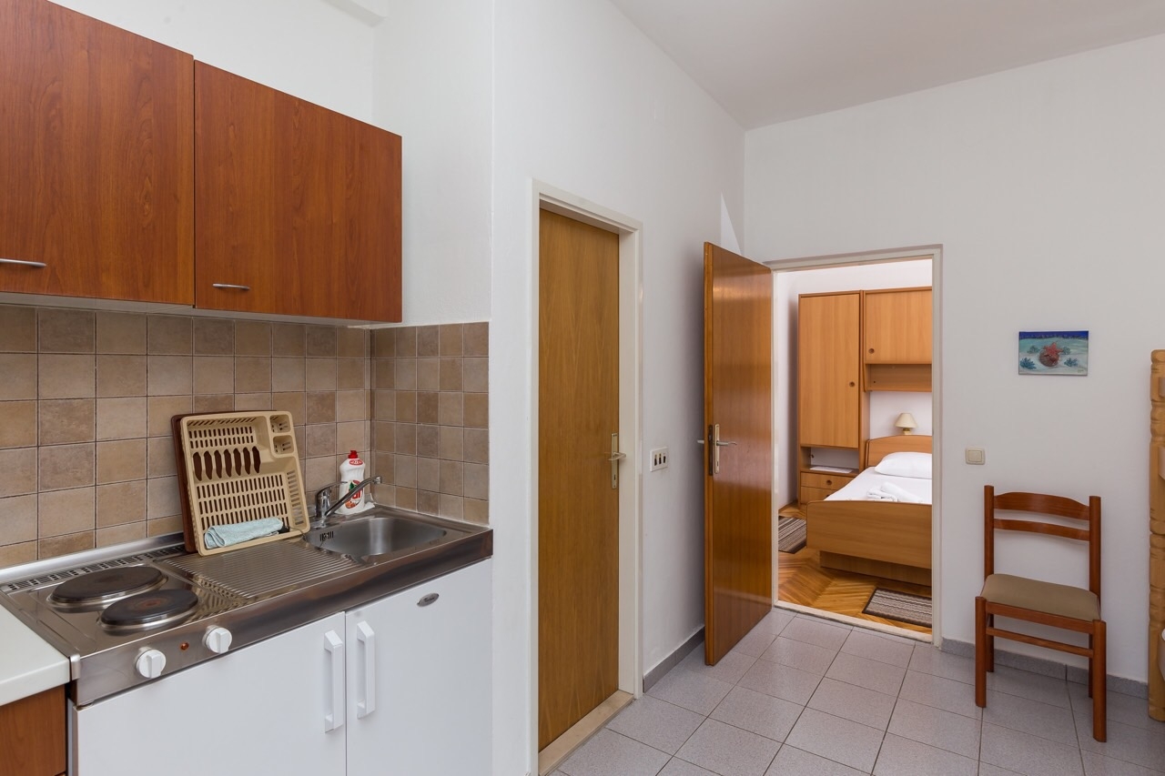 Apartament może przyjąć 4 gości. Łóżka znajdują się w sypialniach, których jest 1, oraz w pokoju dziennym, na powierzchni 25m2. Goście mają dostęp do tarasu, by korzystać z ciepłych, letnich wieczorów. Z apartamentu roztacza się widok na morze. Możliwość przygotowywania posiłków poprzez korzystanie ze wspólnego grilla. W kwaterze dozwolony jest pobyt zwierzęcia domowego, za dopłatą. WLICZONE W CENĘ: taksa pobytowa, sprzątanie końcowe, klimatyzacja, internet, łóżeczko dziecięce, żelazko, deska do prasowania, suszarka do włosów. NIEOBOWIĄZKOWE KOSZTY DODATKOWE: pranie bielizny (5,00 € pranie), miejsce do cumowania łodzi (10,00 € za nocleg), zwierzęta domowe (10,00 € za nocleg). Dostępność dodatkowych usług w rezerwowanym terminie oraz ich cenę (jeśli nie jest podana) należy sprawdzić wcześniej. Za dodatowe usługi, które nie zostały uwzględnione w kalkulacji ceny, płaci się bezpośrednio właścicielowi obiektu, pod warunkiem śe gość korzysta z tych usług.