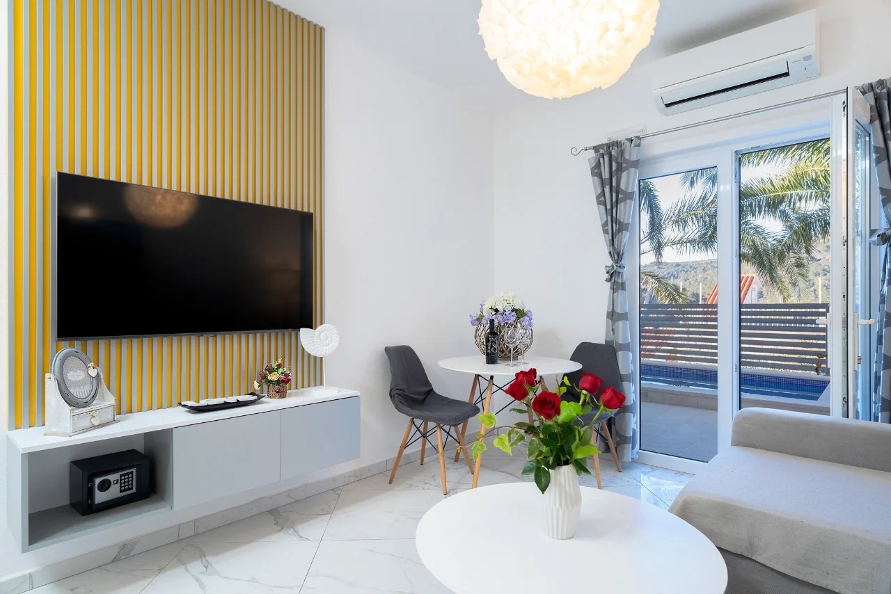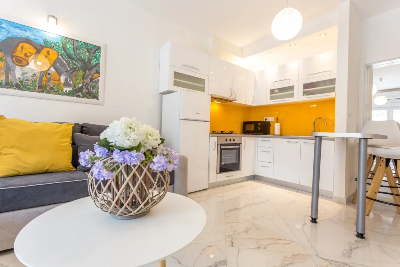 Apartament może przyjąć 3 gości. Łóżka znajdują się w sypialniach, których jest 1, oraz w pokoju dziennym, na powierzchni 33m2. Goście mają dostęp do tarasu, by korzystać z ciepłych, letnich wieczorów. Możliwość przygotowywania posiłków poprzez korzystanie ze wspólnego grilla. W trakcie swojego pobytu goście mogą korzystać ze wspólnego basenu. WLICZONE W CENĘ: taksa pobytowa, sprzątanie końcowe, klimatyzacja, basen, parking, internet, łóżeczko dziecięce, żelazko, suszarka do włosów, leżaki. OBOWIĄZKOWE KOSZTY DODATKOWE: dopłata za krótki termin (procent dopłaty w zalezności od liczby noclegów: 30% - 1, 20% - 2, 10% - 3). Dostępność dodatkowych usług w rezerwowanym terminie oraz ich cenę (jeśli nie jest podana) należy sprawdzić wcześniej. Za dodatowe usługi, które nie zostały uwzględnione w kalkulacji ceny, płaci się bezpośrednio właścicielowi obiektu, pod warunkiem śe gość korzysta z tych usług. Zniżki od ceny podstawowej: bezpłatny dzień 14=13 (przy pobycie, trwającym co najmniej 14 dni, otrzymujecie jeden bezpłatny dzień na pobyt do 31.12.2026).