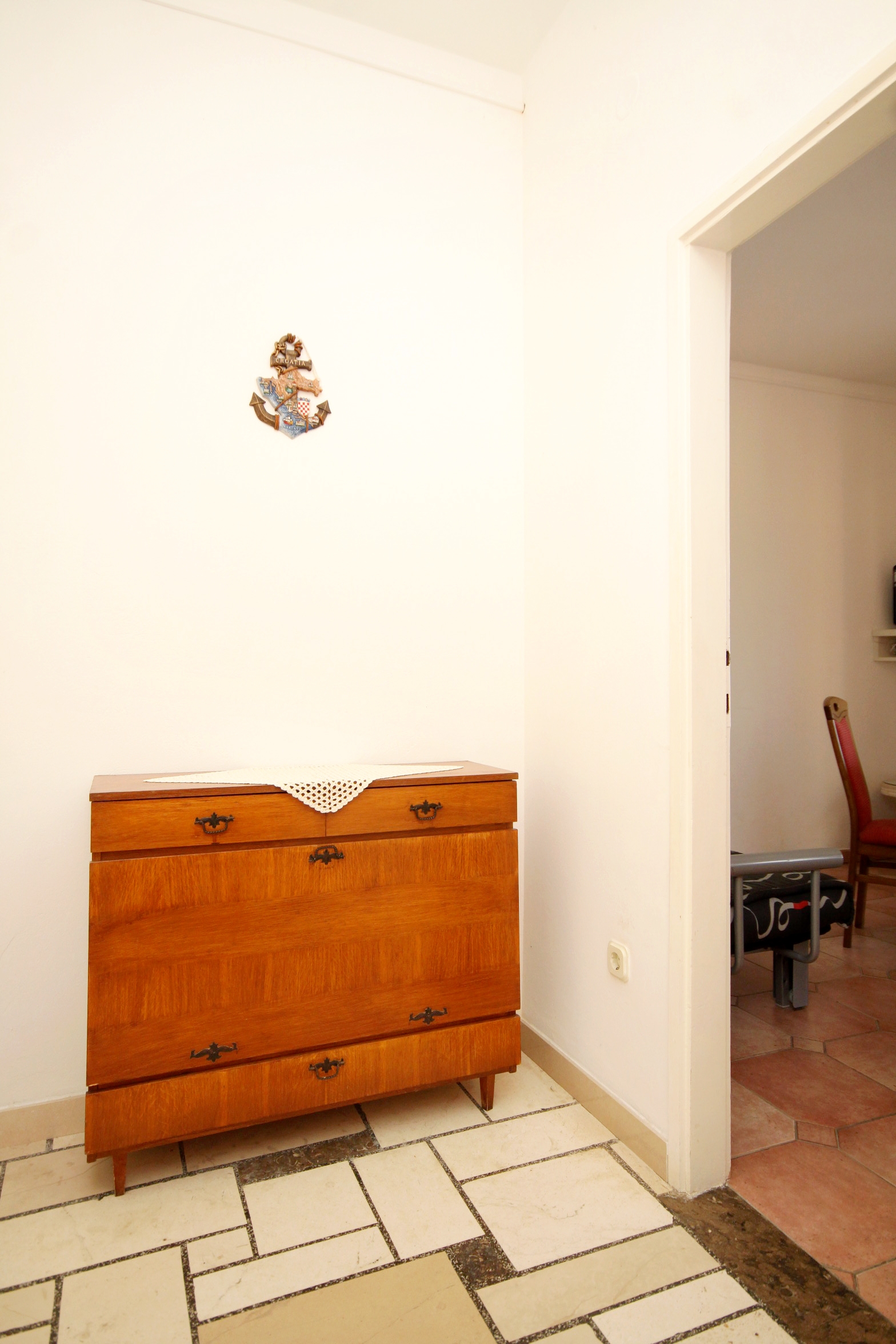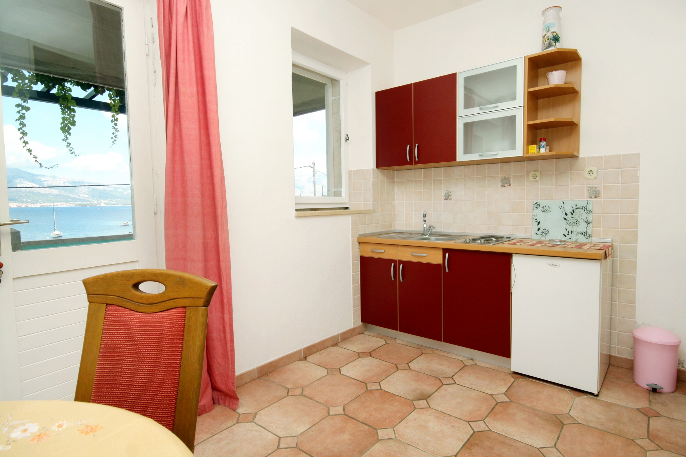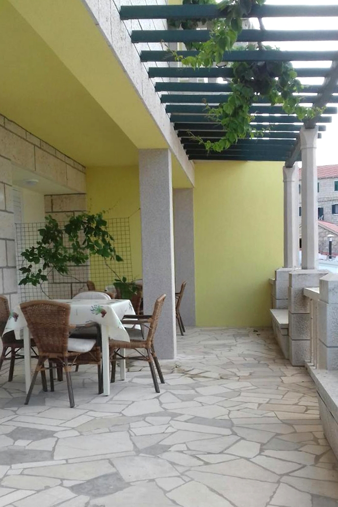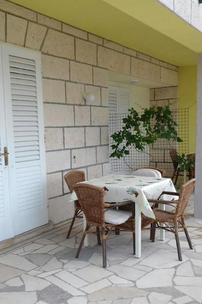 Apartament może przyjąć 4 gości. Łóżka znajdują się w sypialniach, których jest 1, oraz w jadalni, na powierzchni 35m2. Goście mają dostęp do tarasu, by korzystać z ciepłych, letnich wieczorów. Z apartamentu roztacza się widok na morze. Możliwość przygotowywania posiłków poprzez korzystanie ze wspólnego grilla. W kwaterze dozwolony jest pobyt zwierzęcia domowego, za dopłatą. Przez taras rezerwowanej kwatery przechodzą także inni goście lub gospodarze. WLICZONE W CENĘ: taksa pobytowa, sprzątanie końcowe, klimatyzacja, parking, internet, miejsce do cumowania łodzi, żelazko, deska do prasowania, suszarka do włosów. NIEOBOWIĄZKOWE KOSZTY DODATKOWE: zwierzęta domowe (6,00 € za nocleg). Dostępność dodatkowych usług w rezerwowanym terminie oraz ich cenę (jeśli nie jest podana) należy sprawdzić wcześniej. Za dodatowe usługi, które nie zostały uwzględnione w kalkulacji ceny, płaci się bezpośrednio właścicielowi obiektu, pod warunkiem śe gość korzysta z tych usług.