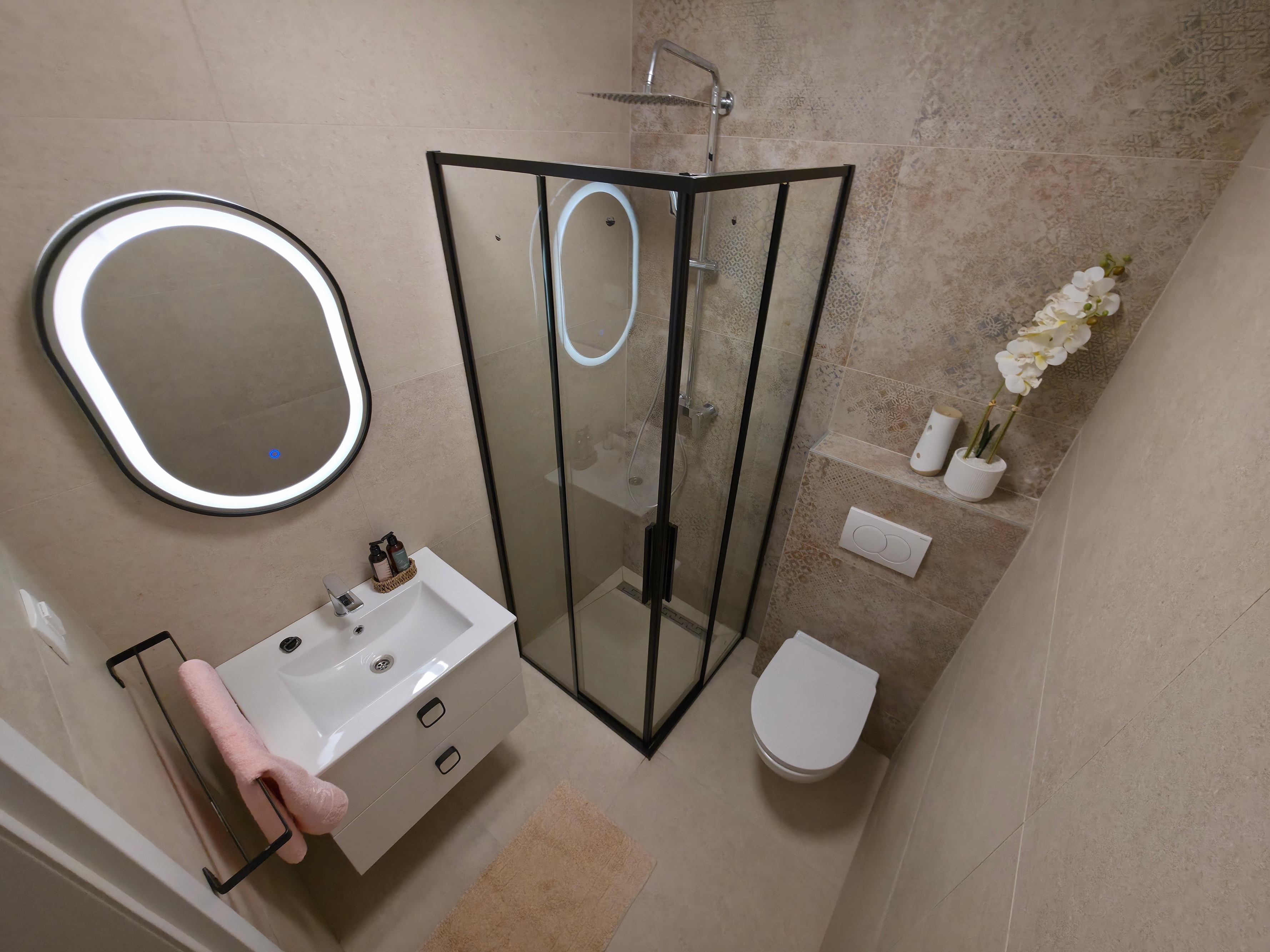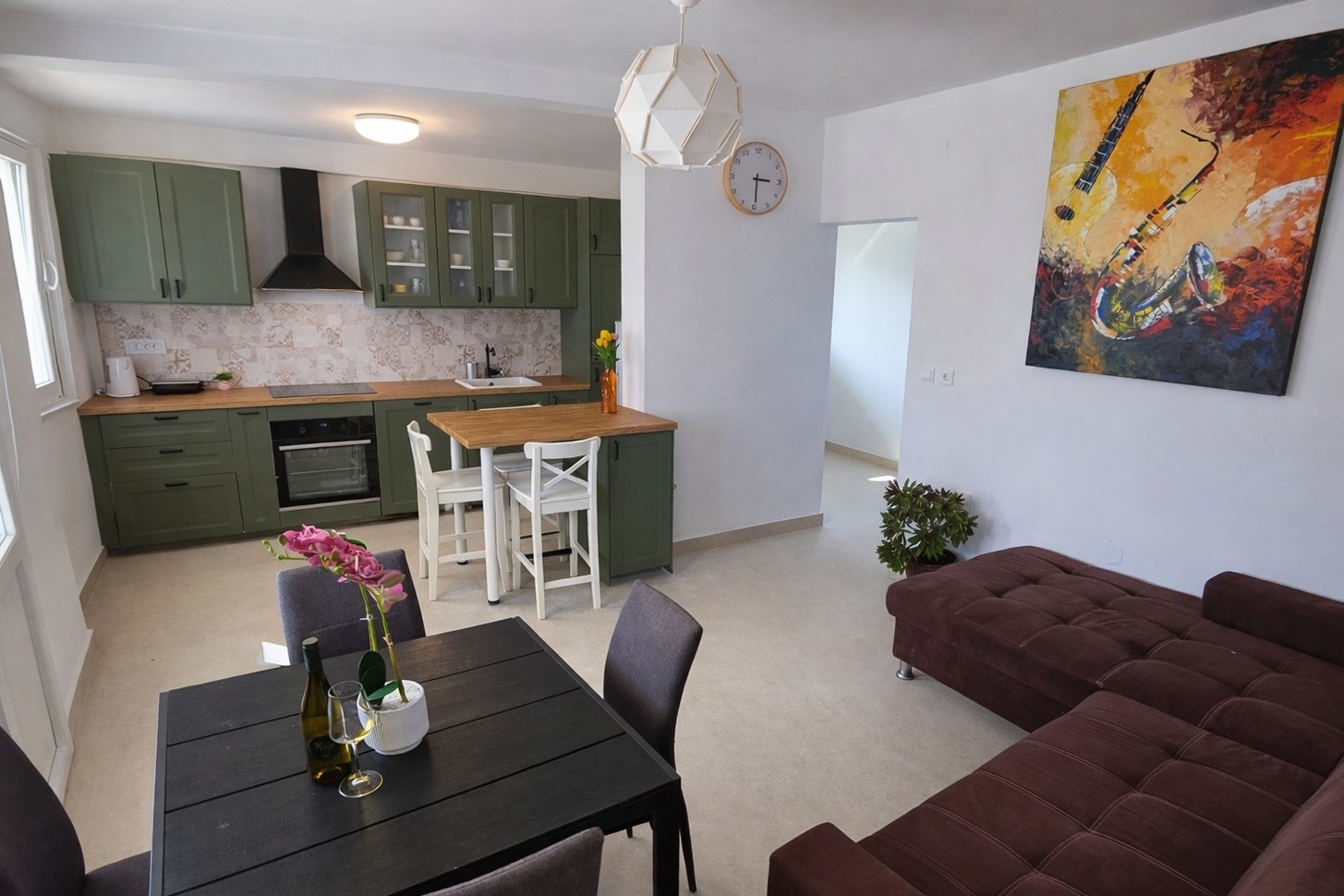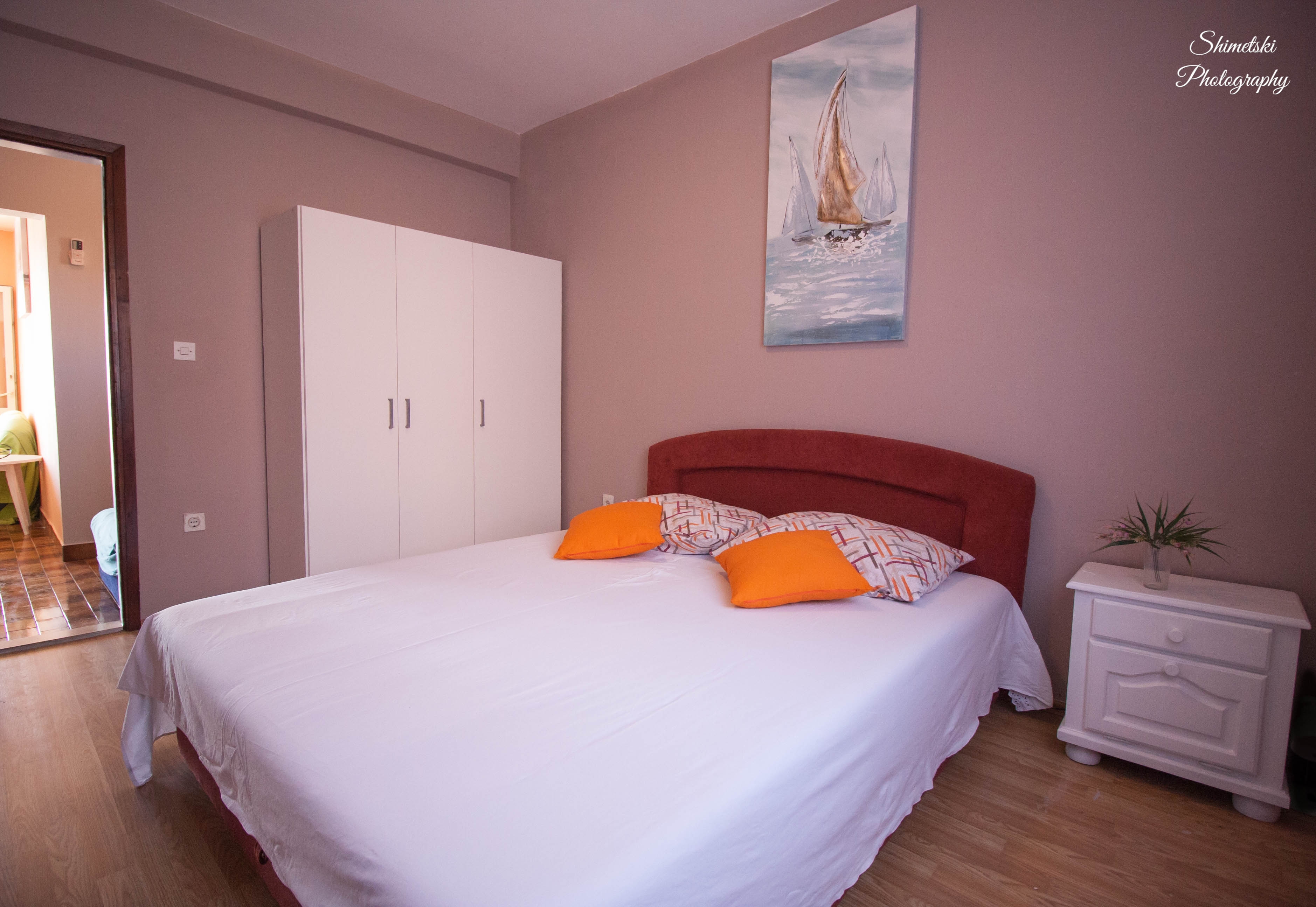 Apartament może przyjąć 5 gości. Łóżka znajdują się w sypialniach, których jest 2, oraz w jadalni, na powierzchni 45m2. Goście mają dostęp do tarasu, by korzystać z ciepłych, letnich wieczorów. Z apartamentu roztacza się widok na morze. Możliwość przygotowywania posiłków poprzez korzystanie ze wspólnego grilla. W kwaterze dozwolony jest pobyt zwierzęcia domowego, za dopłatą. WLICZONE W CENĘ: taksa pobytowa, sprzątanie końcowe, klimatyzacja, parking, internet, miejsce do cumowania łodzi, żelazko. OBOWIĄZKOWE KOSZTY DODATKOWE: dopłata za krótki termin (procent dopłaty w zalezności od liczby noclegów: 30% - 1, 20% - 2, 10% - 3). NIEOBOWIĄZKOWE KOSZTY DODATKOWE: pranie bielizny (5,00 € pranie), łódź (60,00 € za nocleg), zwierzęta domowe (3,00 € za nocleg), dostawka (8,00 € za nocleg). Dostępność dodatkowych usług w rezerwowanym terminie oraz ich cenę (jeśli nie jest podana) należy sprawdzić wcześniej. Za dodatowe usługi, które nie zostały uwzględnione w kalkulacji ceny, płaci się bezpośrednio właścicielowi obiektu, pod warunkiem śe gość korzysta z tych usług.