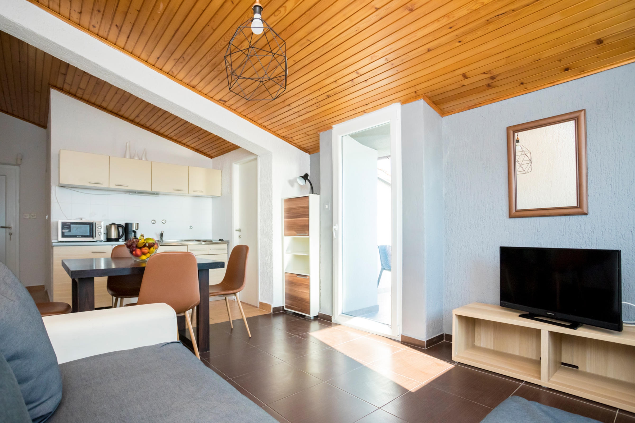 Apartament może przyjąć 5 gości. Łóżka znajdują się w sypialniach, których jest 2, oraz w pokoju dziennym, na powierzchni 47m2. Goście mają dostęp do tarasu, by korzystać z ciepłych, letnich wieczorów. Z apartamentu roztacza się widok na morze. Możliwość przygotowywania posiłków poprzez korzystanie ze wspólnego grilla. W kwaterze dozwolony jest pobyt zwierzęcia domowego, za dopłatą. WLICZONE W CENĘ: taksa pobytowa, sprzątanie końcowe, klimatyzacja, parking, internet. OBOWIĄZKOWE KOSZTY DODATKOWE: dopłata za krótki termin (procent dopłaty w zalezności od liczby noclegów: 30% - 1, 20% - 2, 10% - 3). NIEOBOWIĄZKOWE KOSZTY DODATKOWE: zwierzęta domowe (10,00 € za nocleg). Dostępność dodatkowych usług w rezerwowanym terminie oraz ich cenę (jeśli nie jest podana) należy sprawdzić wcześniej. Za dodatowe usługi, które nie zostały uwzględnione w kalkulacji ceny, płaci się bezpośrednio właścicielowi obiektu, pod warunkiem śe gość korzysta z tych usług.