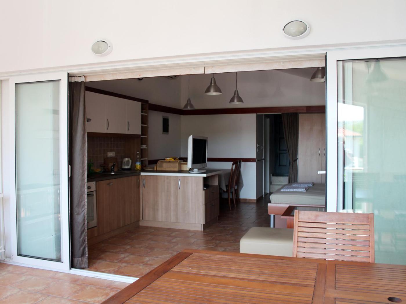 Studio z tarasem i widokiem na morze. Jest to klimatyzowane studio z tarasem z widokiem na morze, a także częścią wypoczynkową z sofą oraz telewizorem z płaskim ekranem i dostępem do kanałów kablowych i kuchnią ze zmywarką i jadalnią. Goście mają do dyspozycji łazienkę z wanną, pralką i suszarką do włosów. Obiekt zapewnia bezpłatny zestaw kosmetyków. Apartament - 3 osobowy. Powierzchnia pokoju ok.: 50 mkw.