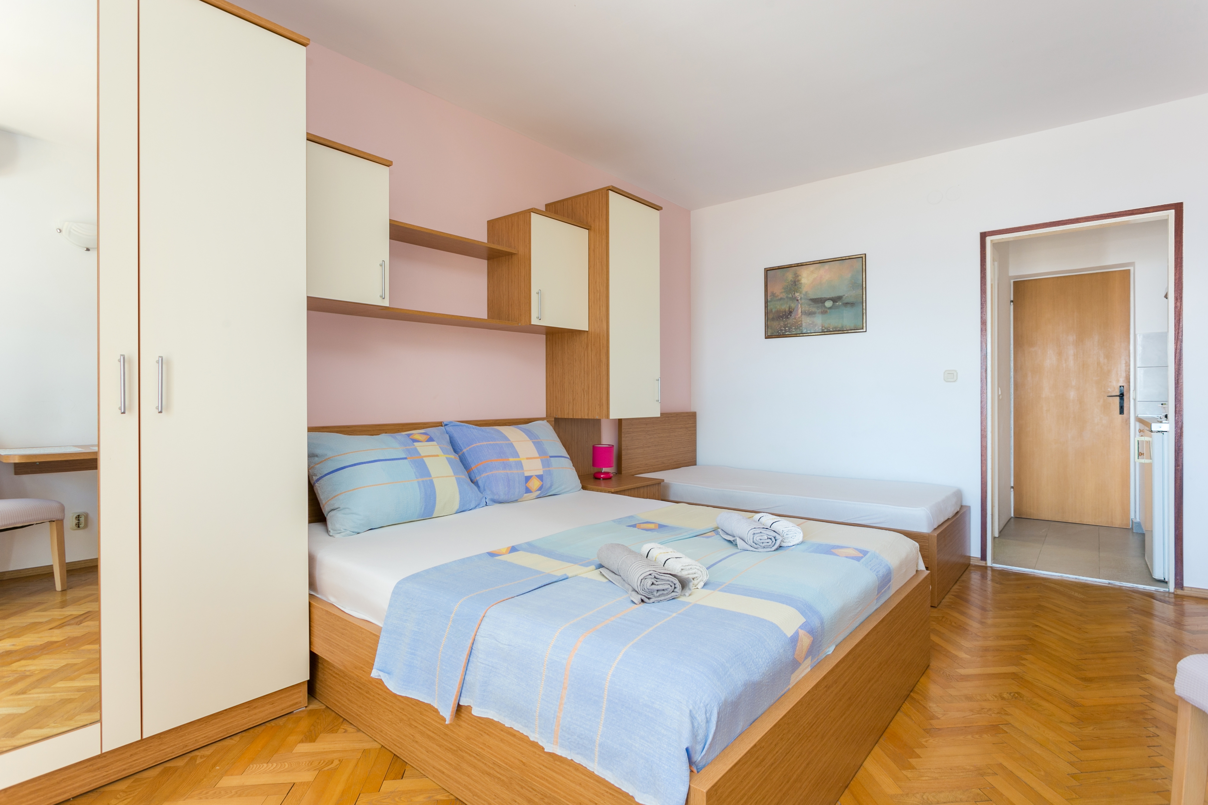 Studio może przyjąć 3 gości. Łóżka znajdują się w sypialniach, których jest 1, na powierzchni 25m2. Goście mają dostęp do tarasu, by korzystać z ciepłych, letnich wieczorów. Z apartamentu typu studio roztacza się widok na morze. WLICZONE W CENĘ: taksa pobytowa, sprzątanie końcowe, centralne ogrzewanie, parking, internet, żelazko, deska do prasowania. OBOWIĄZKOWE KOSZTY DODATKOWE: dopłata za krótki termin (procent dopłaty w zalezności od liczby noclegów: 30% - 1, 20% - 2, 10% - 3). NIEOBOWIĄZKOWE KOSZTY DODATKOWE: klimatyzacja (5,00 € za nocleg), pranie bielizny (5,00 € pranie), rower (10,00 € za dzień (za sztukę)). Dostępność dodatkowych usług w rezerwowanym terminie oraz ich cenę (jeśli nie jest podana) należy sprawdzić wcześniej. Za dodatowe usługi, które nie zostały uwzględnione w kalkulacji ceny, płaci się bezpośrednio właścicielowi obiektu, pod warunkiem śe gość korzysta z tych usług. Zniżki od ceny podstawowej: bezpłatny dzień 14=13 (przy pobycie, trwającym co najmniej 14 dni, otrzymujecie jeden bezpłatny dzień na pobyt do 31.12.2026).