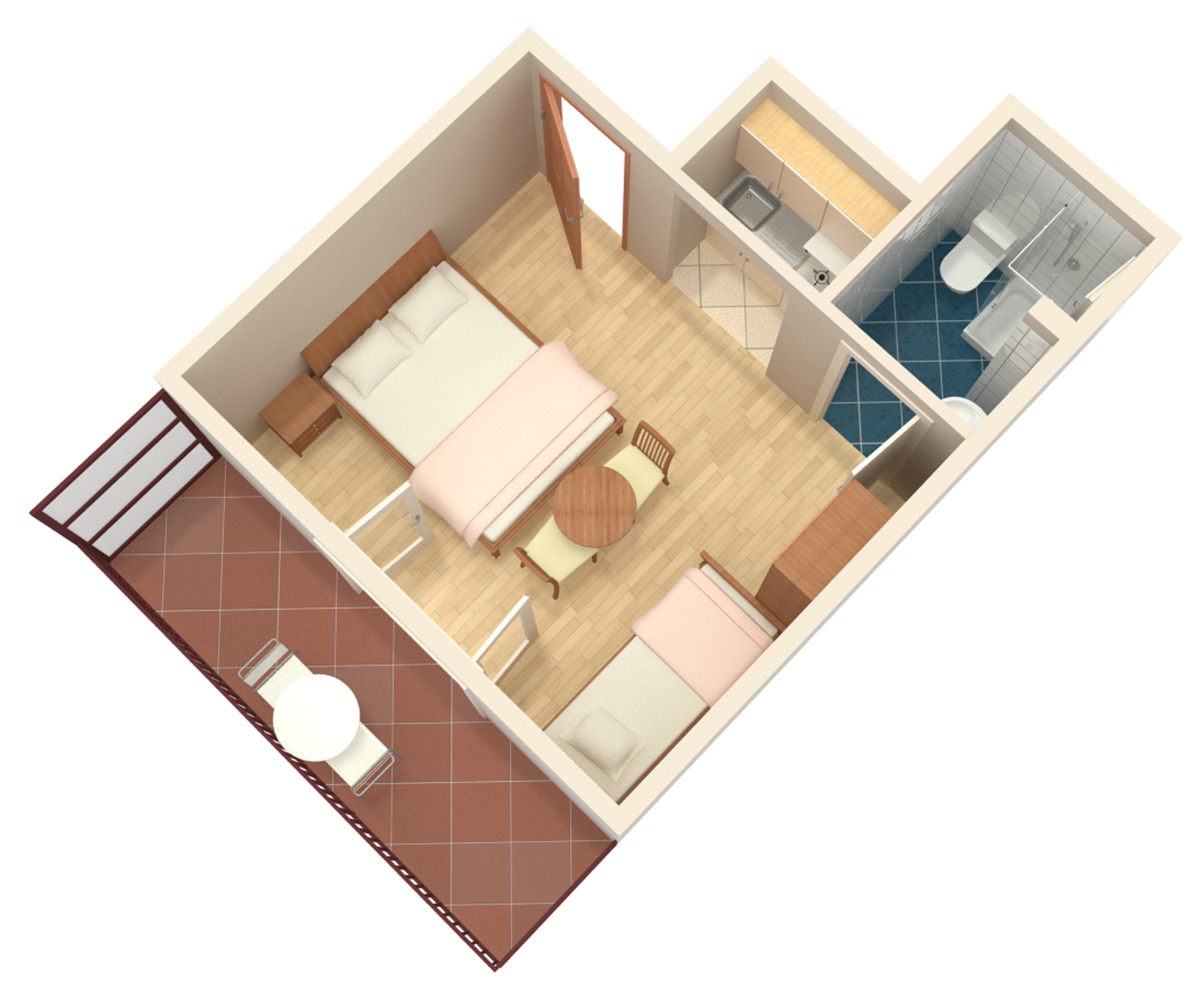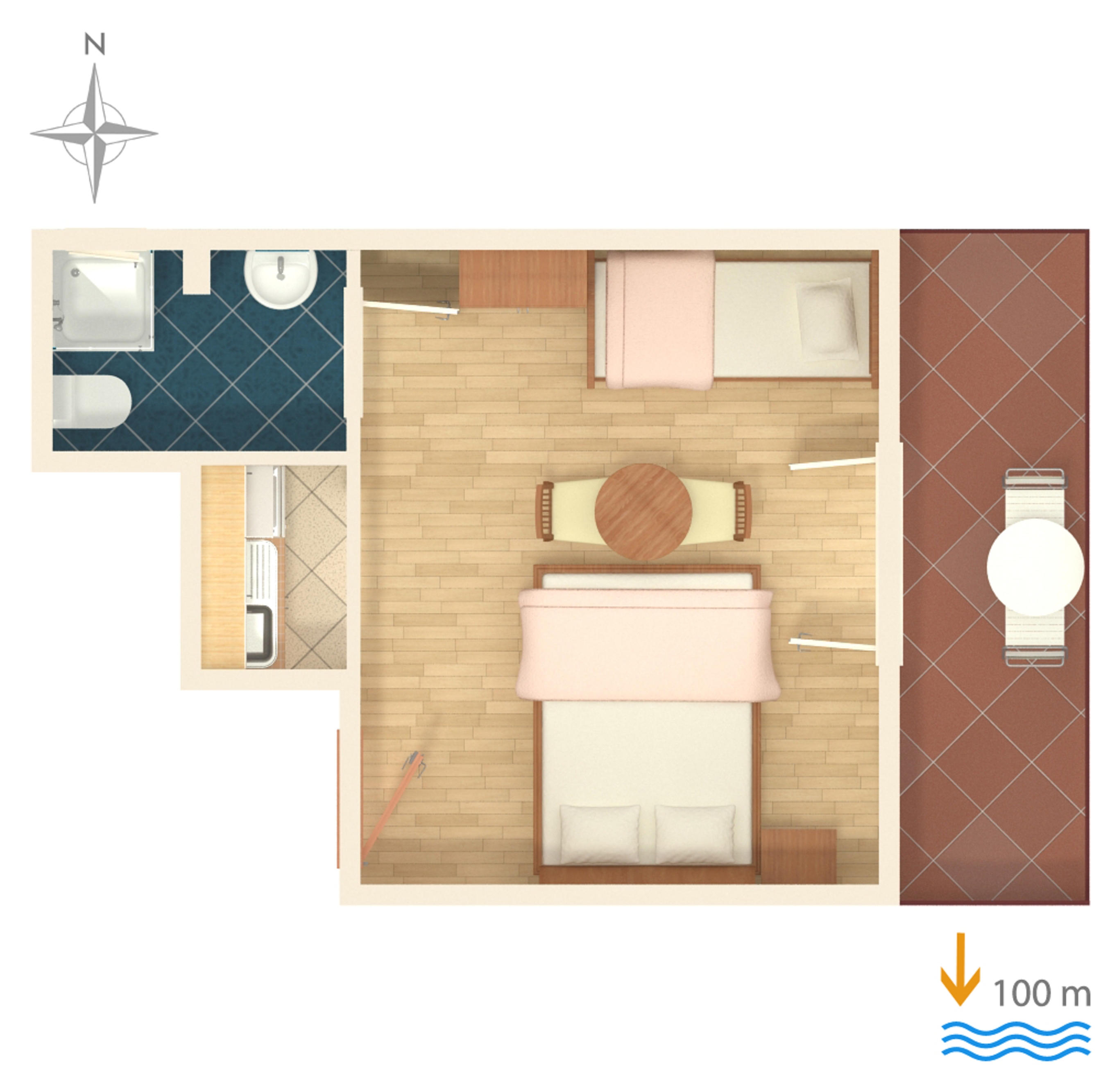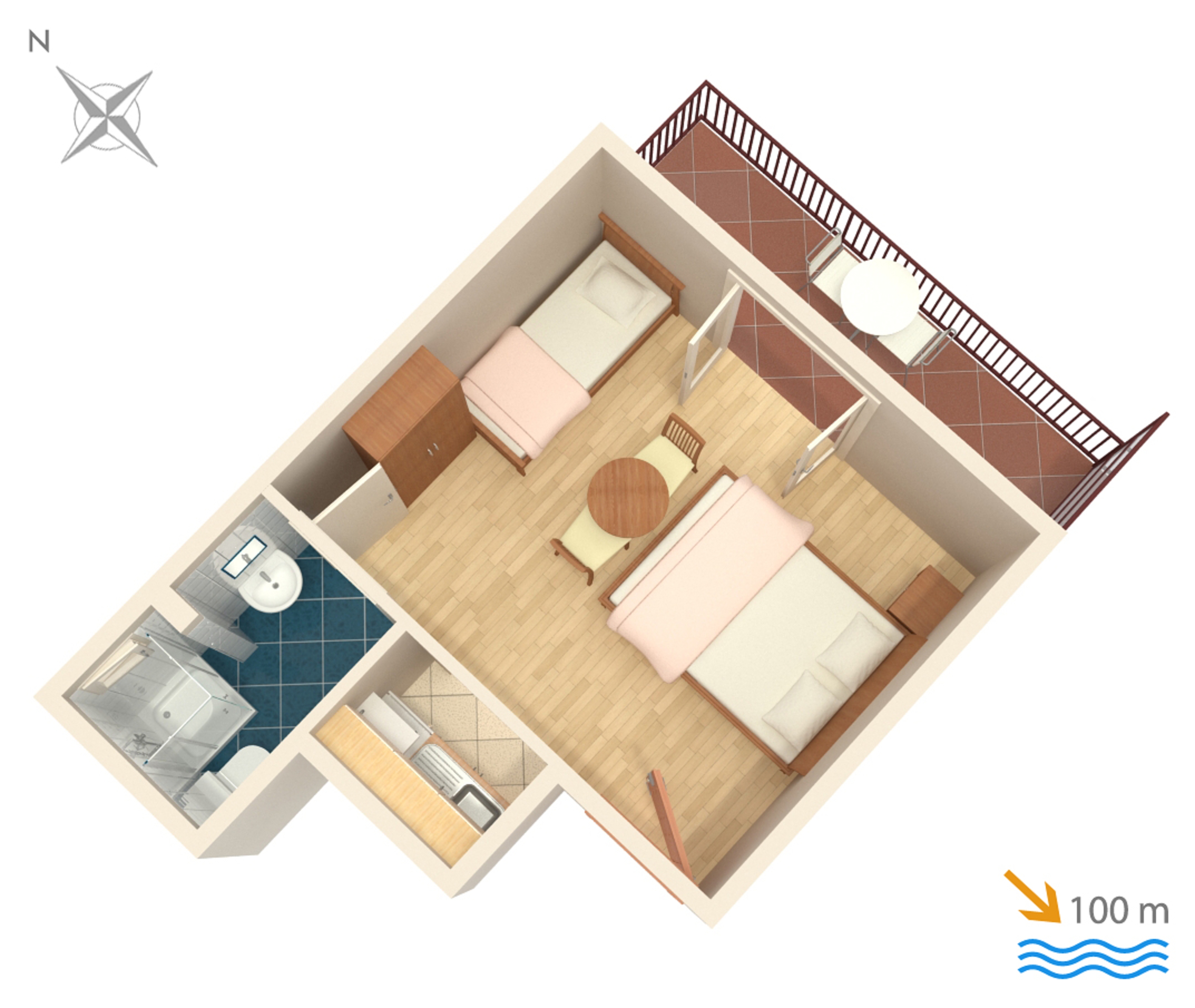Studio może przyjąć 2 gości. Łóżka znajdują się w sypialniach, których jest 1, na powierzchni 18m2. Goście mają dostęp do balkonu, by korzystać z ciepłych, letnich wieczorów. Możliwość przygotowywania posiłków poprzez korzystanie ze wspólnego grilla. WLICZONE W CENĘ: taksa pobytowa, sprzątanie końcowe, klimatyzacja, parking, internet, żelazko, deska do prasowania, suszarka do włosów. OBOWIĄZKOWE KOSZTY DODATKOWE: dopłata za krótki termin (procent dopłaty w zalezności od liczby noclegów: 30% - 1, 20% - 2, 10% - 3). Dostępność dodatkowych usług w rezerwowanym terminie oraz ich cenę (jeśli nie jest podana) należy sprawdzić wcześniej. Za dodatowe usługi, które nie zostały uwzględnione w kalkulacji ceny, płaci się bezpośrednio właścicielowi obiektu, pod warunkiem śe gość korzysta z tych usług.