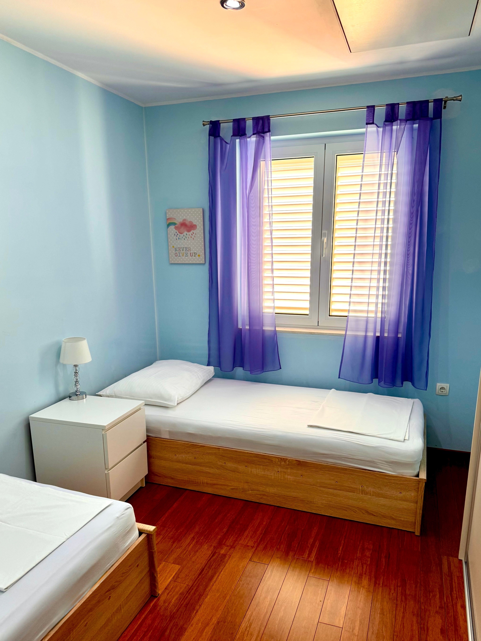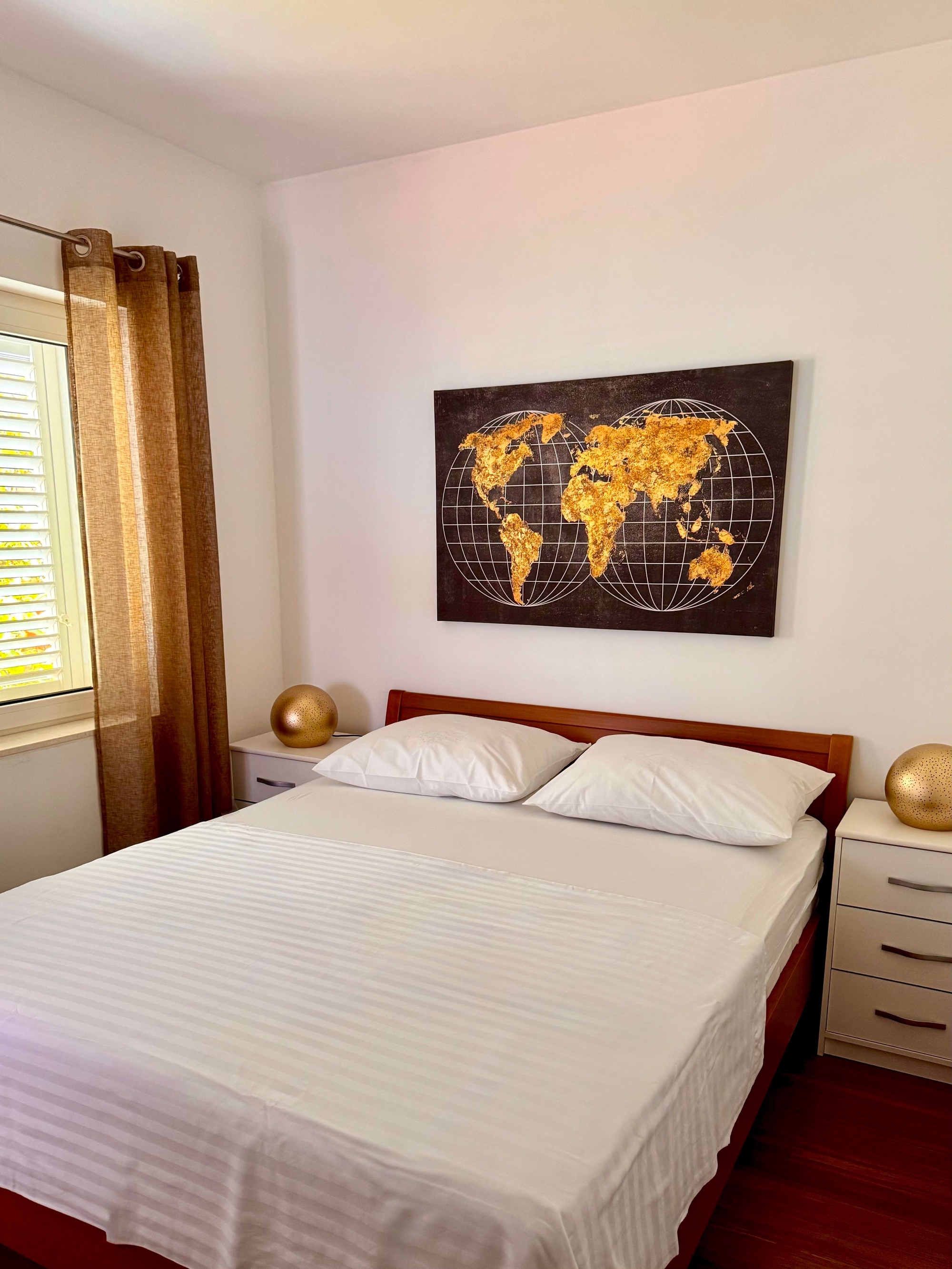 Apartament może przyjąć 4 gości. Łóżka znajdują się w sypialniach, których jest 2, na powierzchni 58m2. Goście mają dostęp do tarasu, by korzystać z ciepłych, letnich wieczorów. Z apartamentu roztacza się widok na morze. Możliwość przygotowywania posiłków poprzez korzystanie ze wspólnego grilla. WLICZONE W CENĘ: taksa pobytowa, sprzątanie końcowe, klimatyzacja, parking, internet, miejsce do cumowania łodzi, żelazko, suszarka do włosów, parasol. Dostępność dodatkowych usług w rezerwowanym terminie oraz ich cenę (jeśli nie jest podana) należy sprawdzić wcześniej. Za dodatowe usługi, które nie zostały uwzględnione w kalkulacji ceny, płaci się bezpośrednio właścicielowi obiektu, pod warunkiem śe gość korzysta z tych usług.