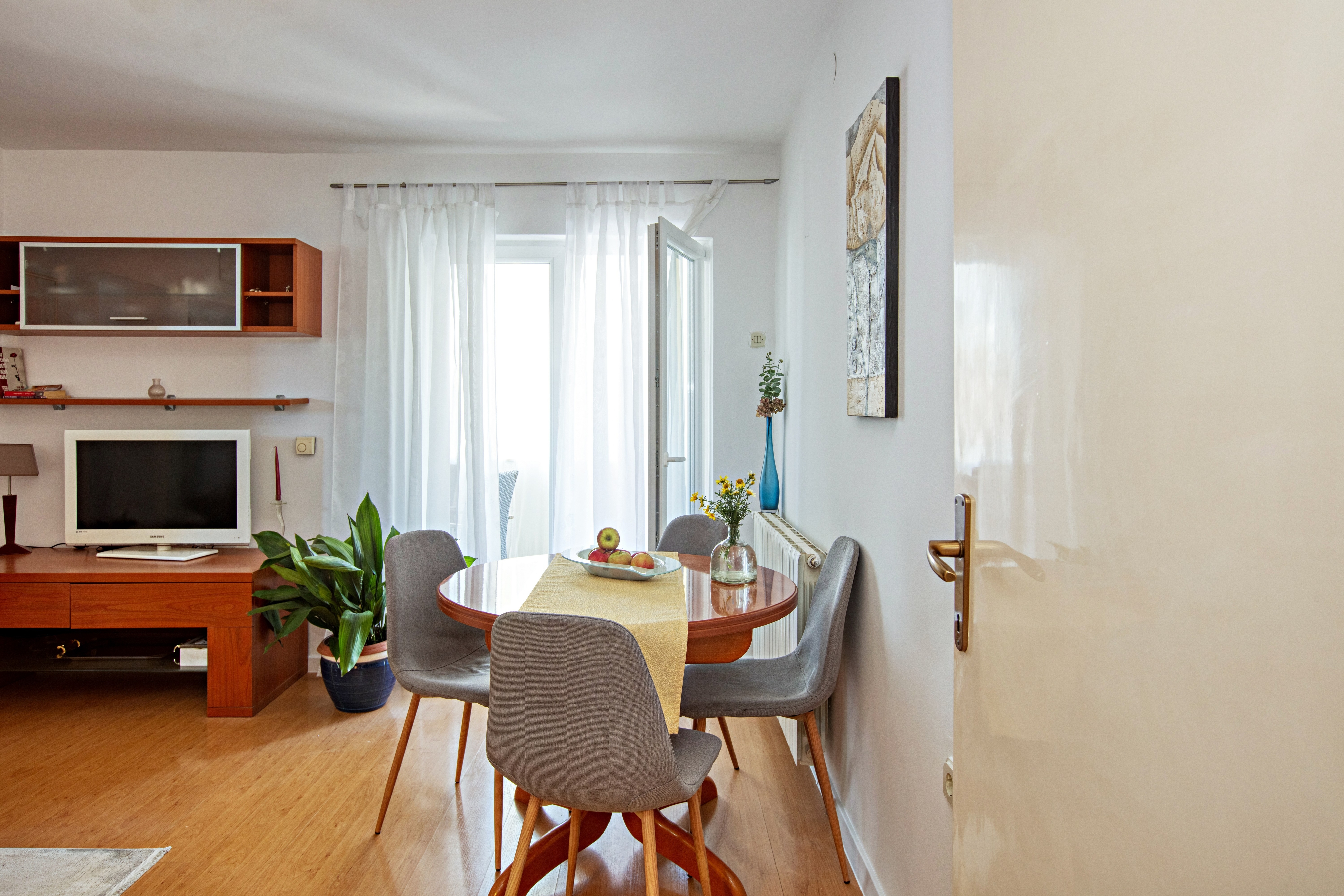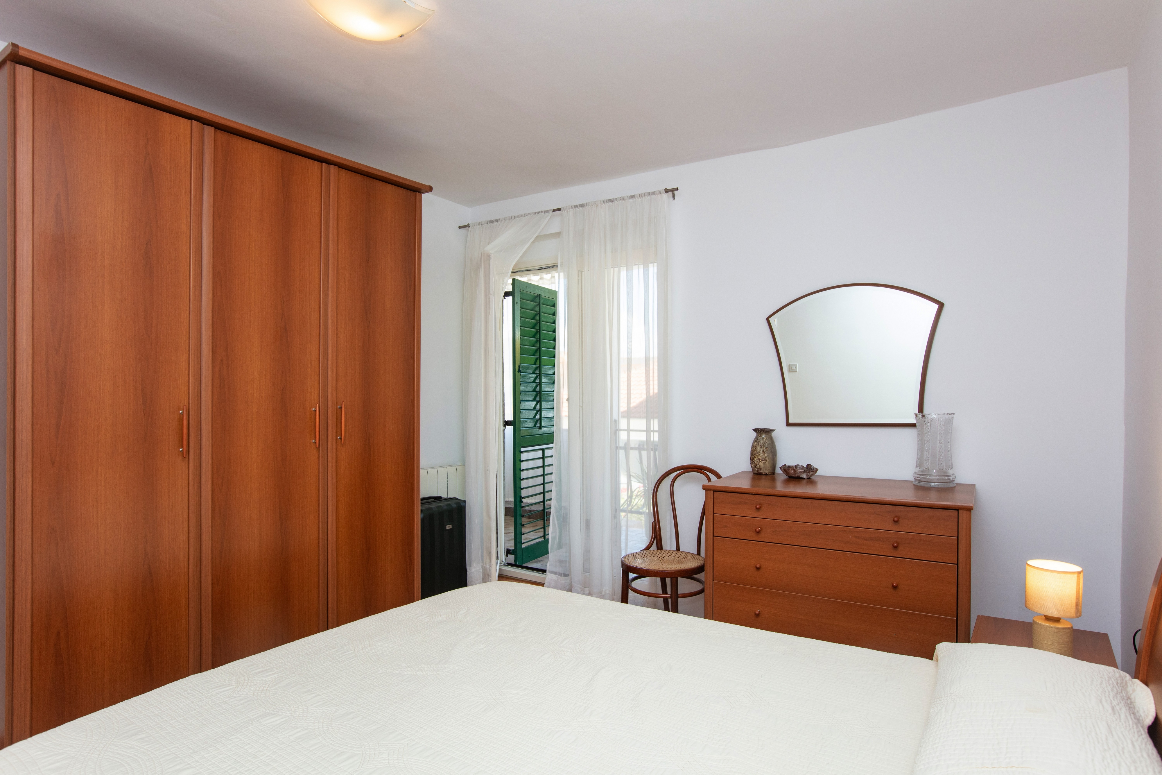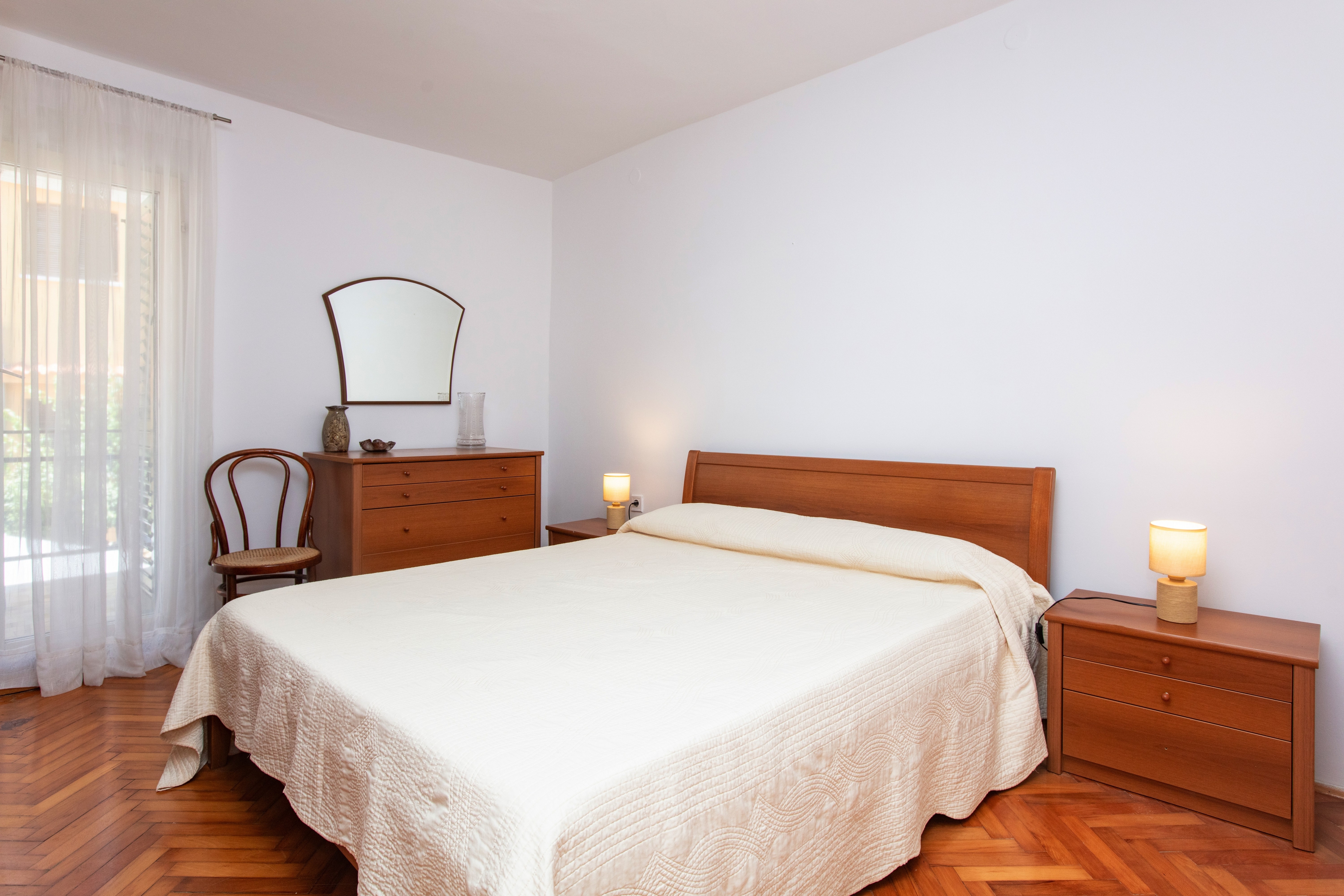 Apartament może przyjąć 4 gości. Łóżka znajdują się w sypialniach, których jest 2, na powierzchni 55m2. Goście mają dostęp do tarasu, by korzystać z ciepłych, letnich wieczorów. Możliwość przygotowywania posiłków poprzez korzystanie ze wspólnego grilla. W kwaterze dozwolony jest pobyt zwierzęcia domowego, za dopłatą. WLICZONE W CENĘ: taksa pobytowa, sprzątanie końcowe, klimatyzacja, internet, łóżeczko dziecięce, suszarka do włosów. OBOWIĄZKOWE KOSZTY DODATKOWE: dopłata za krótki termin (procent dopłaty w zalezności od liczby noclegów: 30% - 1, 20% - 2, 10% - 3). NIEOBOWIĄZKOWE KOSZTY DODATKOWE: zwierzęta domowe (5,00 € za nocleg). Dostępność dodatkowych usług w rezerwowanym terminie oraz ich cenę (jeśli nie jest podana) należy sprawdzić wcześniej. Za dodatowe usługi, które nie zostały uwzględnione w kalkulacji ceny, płaci się bezpośrednio właścicielowi obiektu, pod warunkiem śe gość korzysta z tych usług.