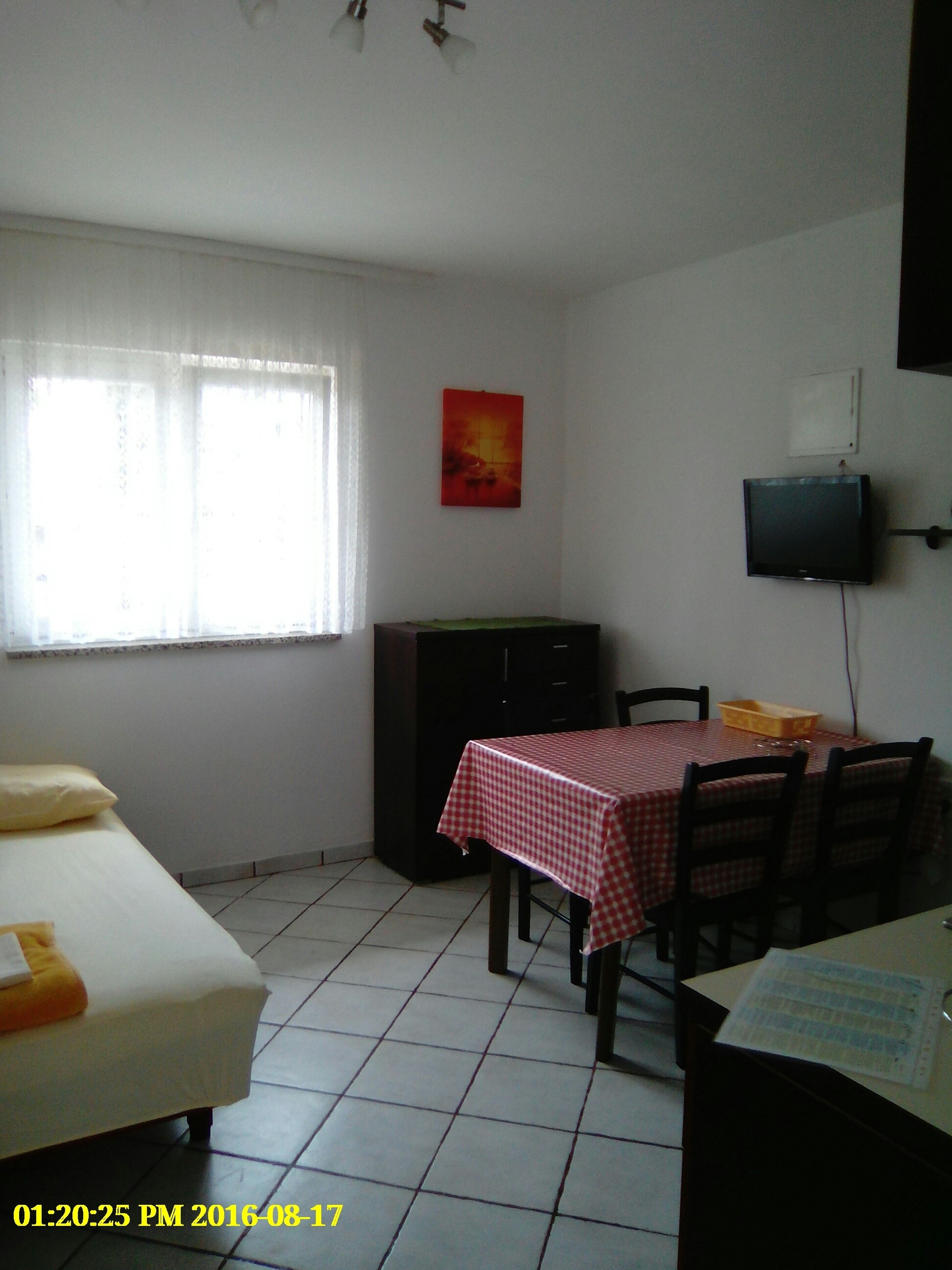 Apartament może przyjąć 4 gości. Łóżka znajdują się w sypialniach, których jest 1, oraz w pokoju dziennym, na powierzchni 35m2. Goście mają dostęp do tarasu, by korzystać z ciepłych, letnich wieczorów. Możliwość przygotowywania posiłków poprzez korzystanie ze wspólnego grilla. WLICZONE W CENĘ: taksa pobytowa, sprzątanie końcowe, klimatyzacja, parking, internet, suszarka do włosów, przenośny grill. OBOWIĄZKOWE KOSZTY DODATKOWE: dopłata za krótki termin (procent dopłaty w zalezności od liczby noclegów: 30% - 1, 20% - 2, 10% - 3). NIEOBOWIĄZKOWE KOSZTY DODATKOWE: pranie bielizny (7,00 € pranie). Dostępność dodatkowych usług w rezerwowanym terminie oraz ich cenę (jeśli nie jest podana) należy sprawdzić wcześniej. Za dodatowe usługi, które nie zostały uwzględnione w kalkulacji ceny, płaci się bezpośrednio właścicielowi obiektu, pod warunkiem śe gość korzysta z tych usług. Zniżki od ceny podstawowej: bezpłatny dzień 14=13 (przy pobycie, trwającym co najmniej 14 dni, otrzymujecie jeden bezpłatny dzień na pobyt do 31.12.2026).