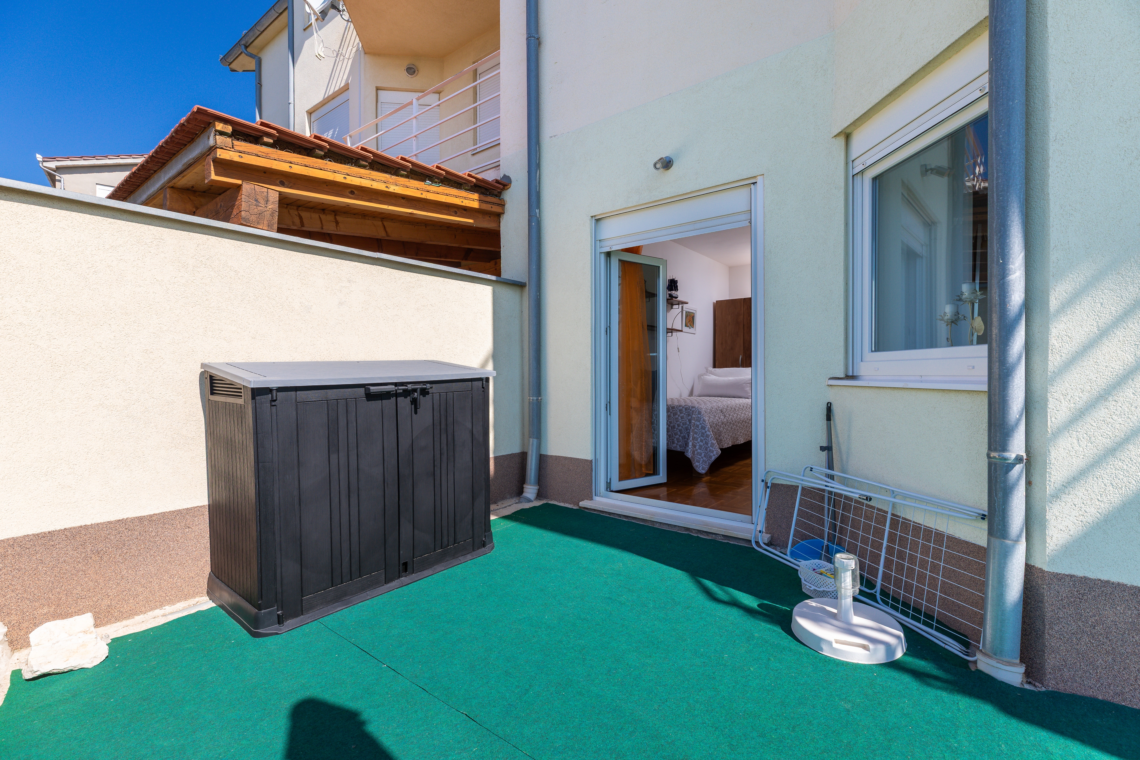 Apartament może przyjąć 5 gości. Łóżka znajdują się w sypialniach, których jest 2, oraz w pokoju dziennym, na powierzchni 60m2. Goście mają dostęp do tarasu, by korzystać z ciepłych, letnich wieczorów. Z apartamentu roztacza się widok na morze. WLICZONE W CENĘ: taksa pobytowa, sprzątanie końcowe, klimatyzacja, parking, internet, żelazko, deska do prasowania, suszarka do włosów. OBOWIĄZKOWE KOSZTY DODATKOWE: dopłata za krótki termin (procent dopłaty w zalezności od liczby noclegów: 30% - 1, 20% - 2, 10% - 3). Dostępność dodatkowych usług w rezerwowanym terminie oraz ich cenę (jeśli nie jest podana) należy sprawdzić wcześniej. Za dodatowe usługi, które nie zostały uwzględnione w kalkulacji ceny, płaci się bezpośrednio właścicielowi obiektu, pod warunkiem śe gość korzysta z tych usług. Zniżki od ceny podstawowej: bezpłatny dzień 14=13 (przy pobycie, trwającym co najmniej 14 dni, otrzymujecie jeden bezpłatny dzień na pobyt do 31.12.2026).
