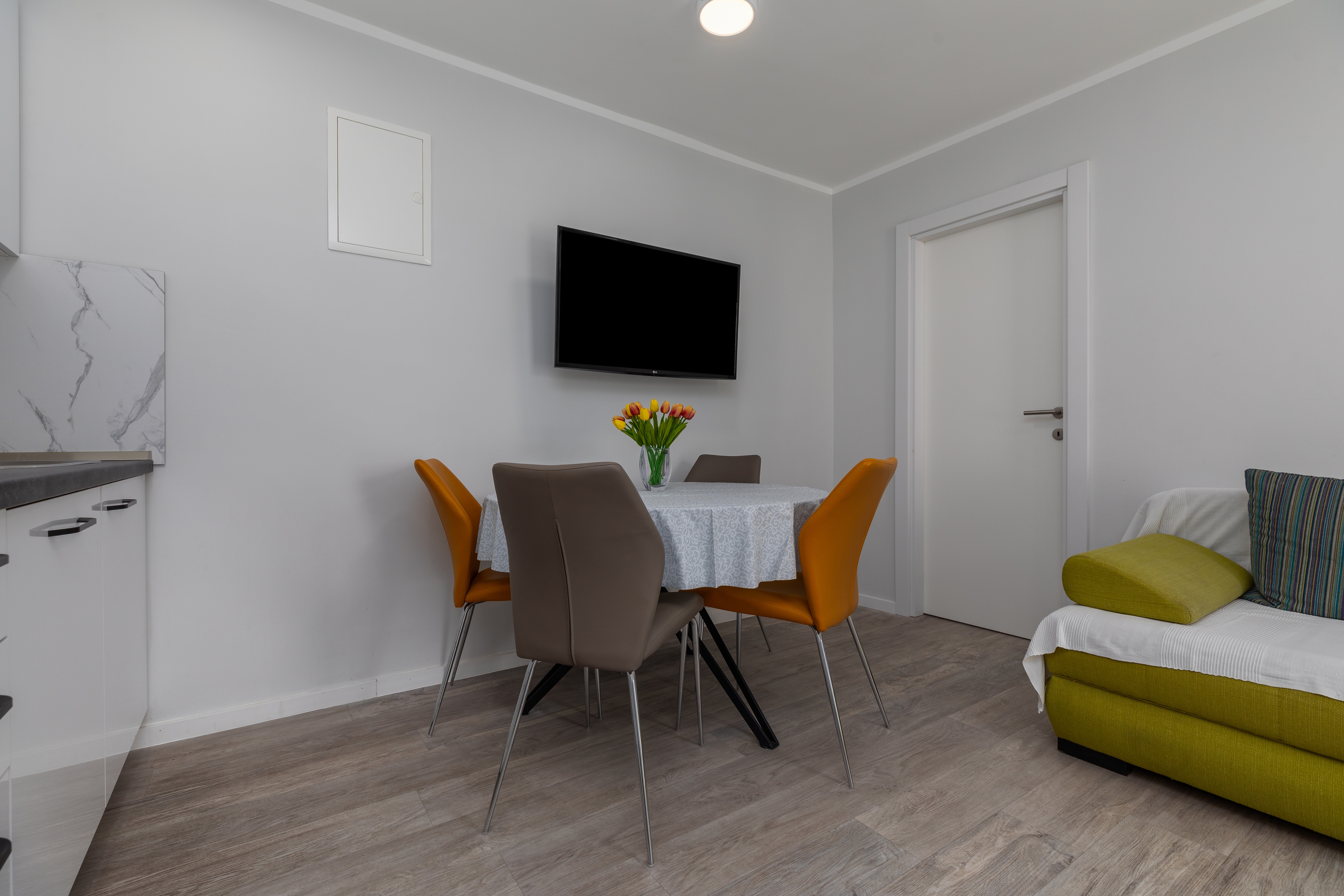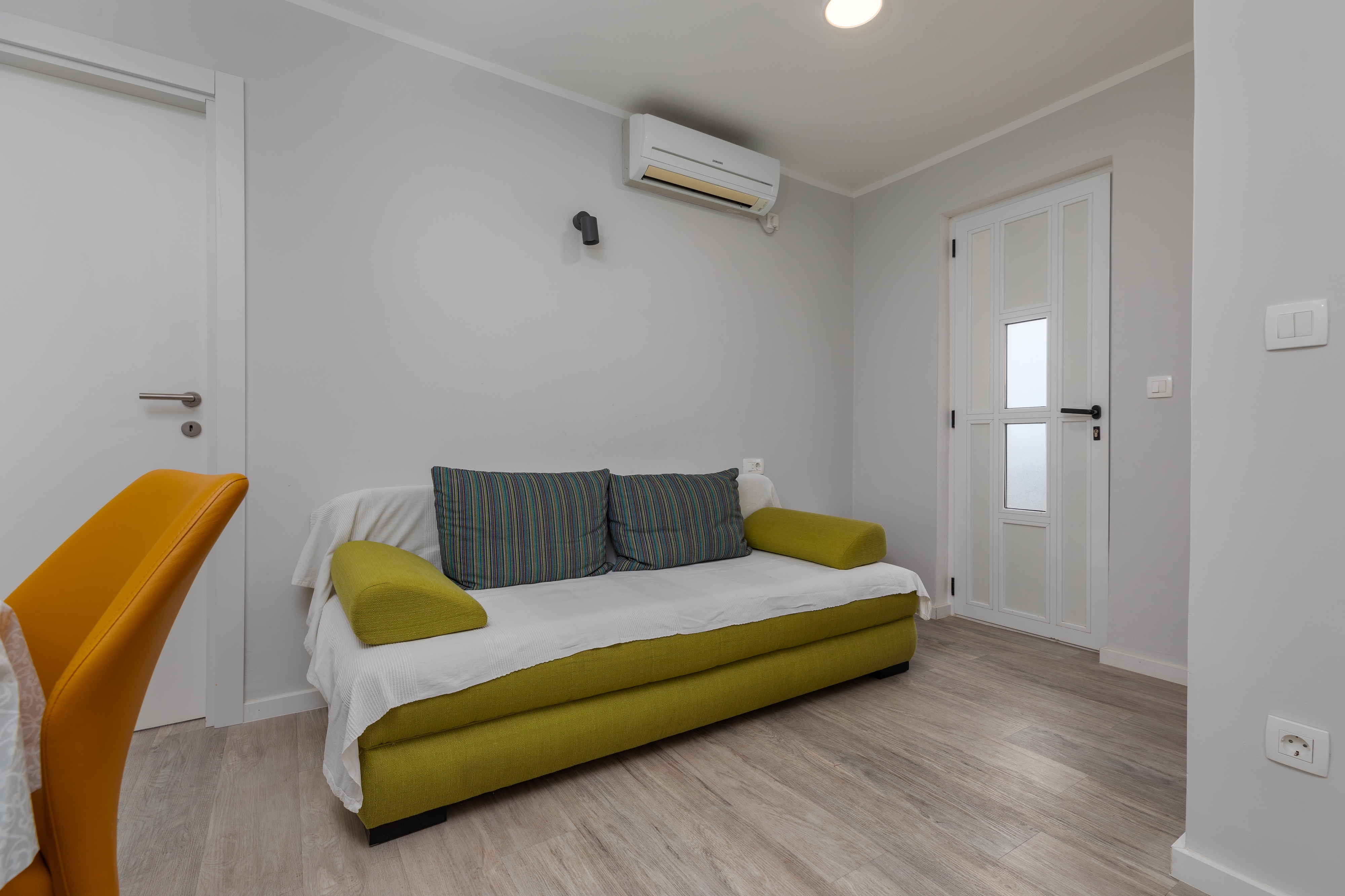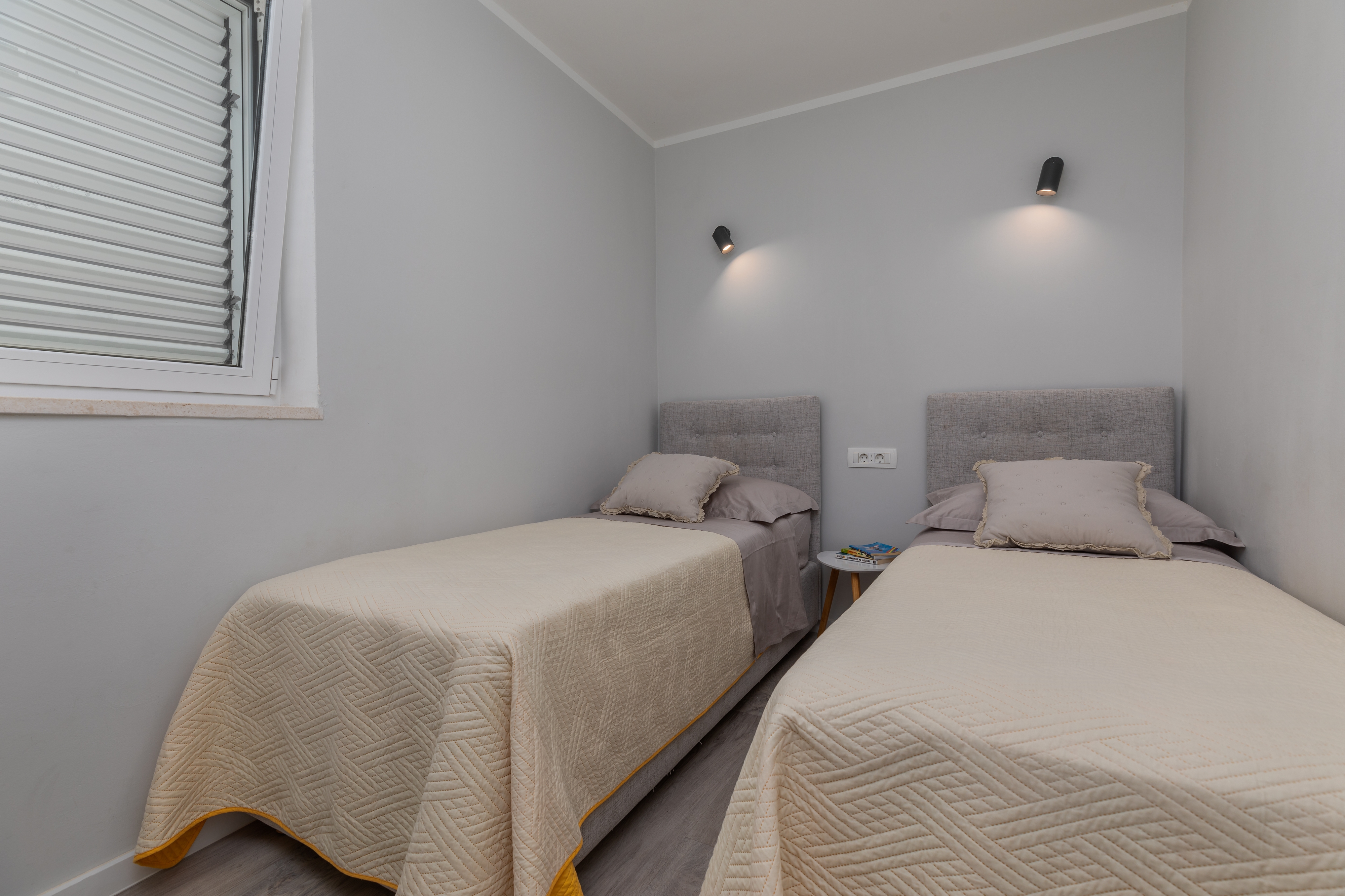 Apartament może przyjąć 5 gości. Łóżka znajdują się w sypialniach, których jest 2, oraz w pokoju dziennym, na powierzchni 38m2. Goście mają dostęp do tarasu, by korzystać z ciepłych, letnich wieczorów. Z apartamentu roztacza się widok na morze. Możliwość przygotowywania posiłków poprzez korzystanie ze wspólnego grilla. W trakcie swojego pobytu goście mogą korzystać ze wspólnego basenu. WLICZONE W CENĘ: taksa pobytowa, sprzątanie końcowe, klimatyzacja, basen, parking, internet, łóżeczko dziecięce, żelazko, deska do prasowania, suszarka do włosów. OBOWIĄZKOWE KOSZTY DODATKOWE: dopłata za krótki termin (procent dopłaty w zalezności od liczby noclegów: 30% - 1, 20% - 2, 10% - 3). Dostępność dodatkowych usług w rezerwowanym terminie oraz ich cenę (jeśli nie jest podana) należy sprawdzić wcześniej. Za dodatowe usługi, które nie zostały uwzględnione w kalkulacji ceny, płaci się bezpośrednio właścicielowi obiektu, pod warunkiem śe gość korzysta z tych usług.