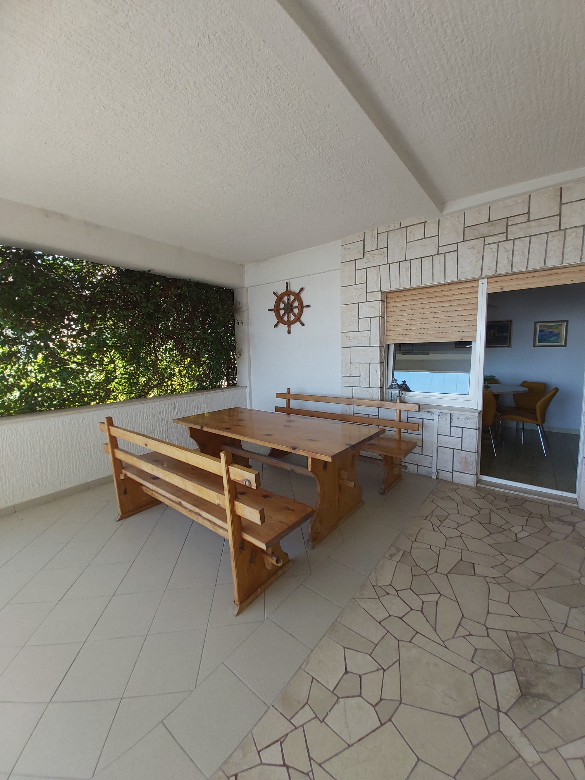 Apartament może przyjąć 6 gości. Łóżka znajdują się w sypialniach, których jest 3, na powierzchni 103m2. Goście mają dostęp do tarasu, by korzystać z ciepłych, letnich wieczorów. Z apartamentu roztacza się widok na morze. Możliwość przygotowywania posiłków poprzez korzystanie ze wspólnego grilla. WLICZONE W CENĘ: taksa pobytowa, sprzątanie końcowe, klimatyzacja, parking, internet, pranie bielizny, żelazko, deska do prasowania, suszarka do włosów, parasol, leżaki. OBOWIĄZKOWE KOSZTY DODATKOWE: dopłata za krótki termin (procent dopłaty w zalezności od liczby noclegów: 30% - 1, 20% - 2, 10% - 3). Dostępność dodatkowych usług w rezerwowanym terminie oraz ich cenę (jeśli nie jest podana) należy sprawdzić wcześniej. Za dodatowe usługi, które nie zostały uwzględnione w kalkulacji ceny, płaci się bezpośrednio właścicielowi obiektu, pod warunkiem śe gość korzysta z tych usług.
