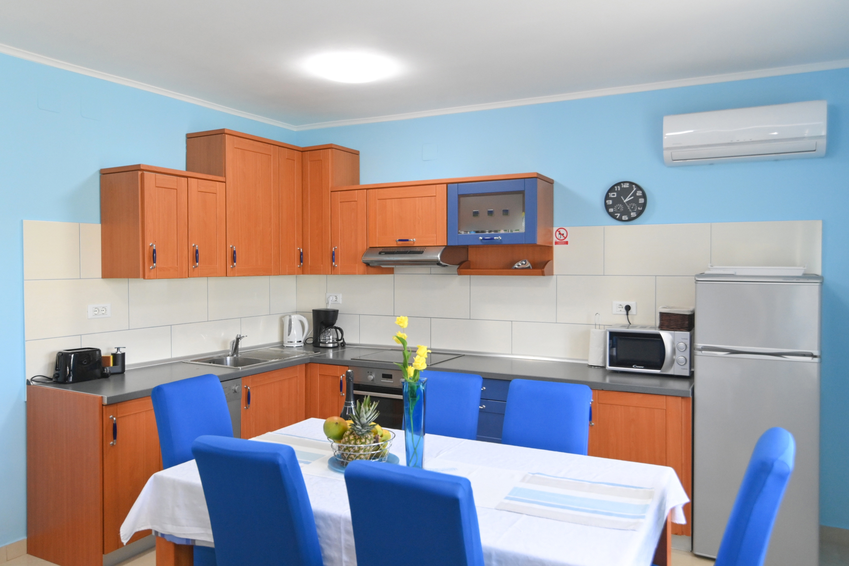 Apartament może przyjąć 6 gości. Łóżka znajdują się w sypialniach, których jest 2, oraz w pokoju dziennym, na powierzchni 80m2. Goście mają dostęp do tarasu, by korzystać z ciepłych, letnich wieczorów. Z apartamentu roztacza się widok na morze. Możliwość przygotowywania posiłków poprzez korzystanie ze wspólnego grilla. W trakcie swojego pobytu goście mogą korzystać ze wspólnego basenu. W kwaterze dozwolony jest pobyt zwierzęcia domowego, za dopłatą. WLICZONE W CENĘ: taksa pobytowa, sprzątanie końcowe, klimatyzacja, centralne ogrzewanie, basen, parking, internet, żelazko, deska do prasowania, suszarka do włosów, parasol, leżaki. NIEOBOWIĄZKOWE KOSZTY DODATKOWE: zwierzęta domowe (15,00 € za nocleg). Dostępność dodatkowych usług w rezerwowanym terminie oraz ich cenę (jeśli nie jest podana) należy sprawdzić wcześniej. Za dodatowe usługi, które nie zostały uwzględnione w kalkulacji ceny, płaci się bezpośrednio właścicielowi obiektu, pod warunkiem śe gość korzysta z tych usług.