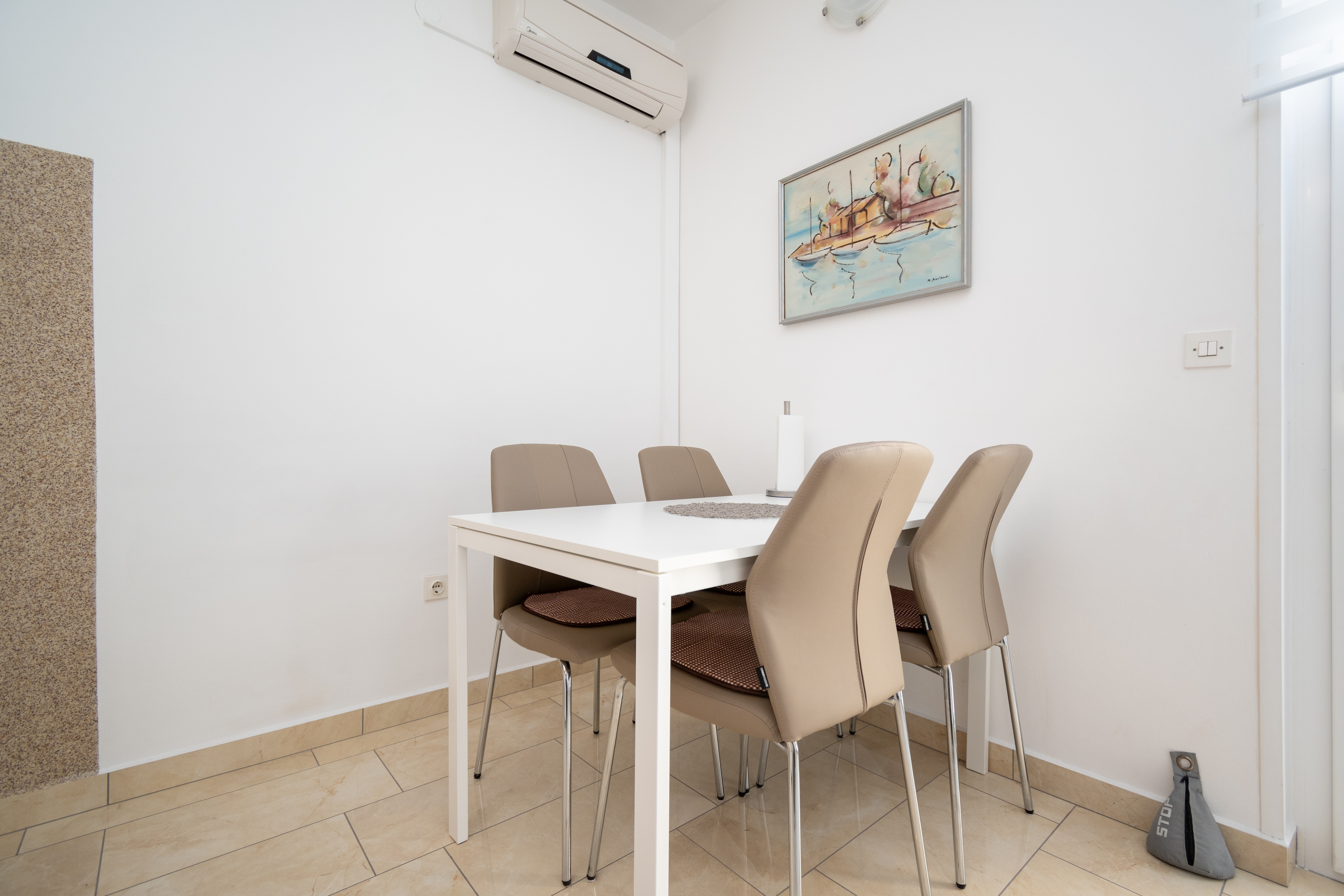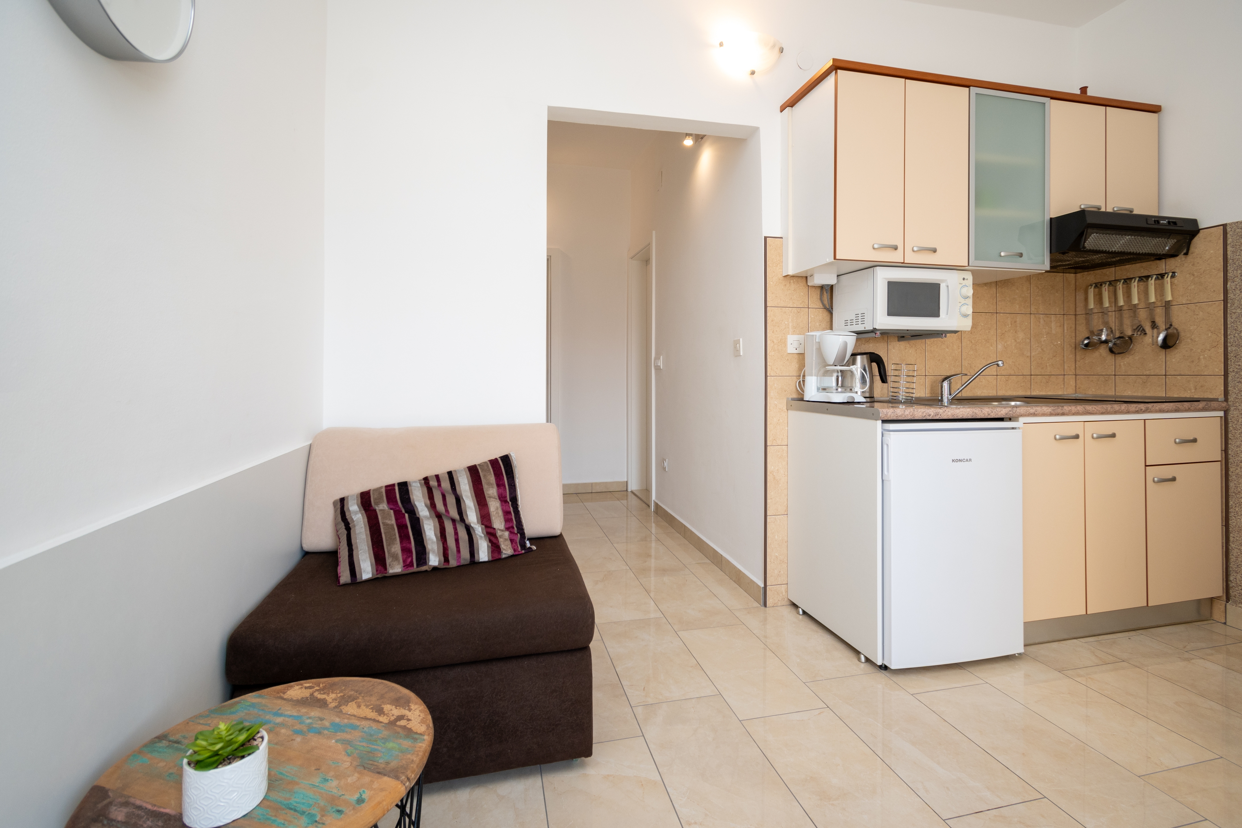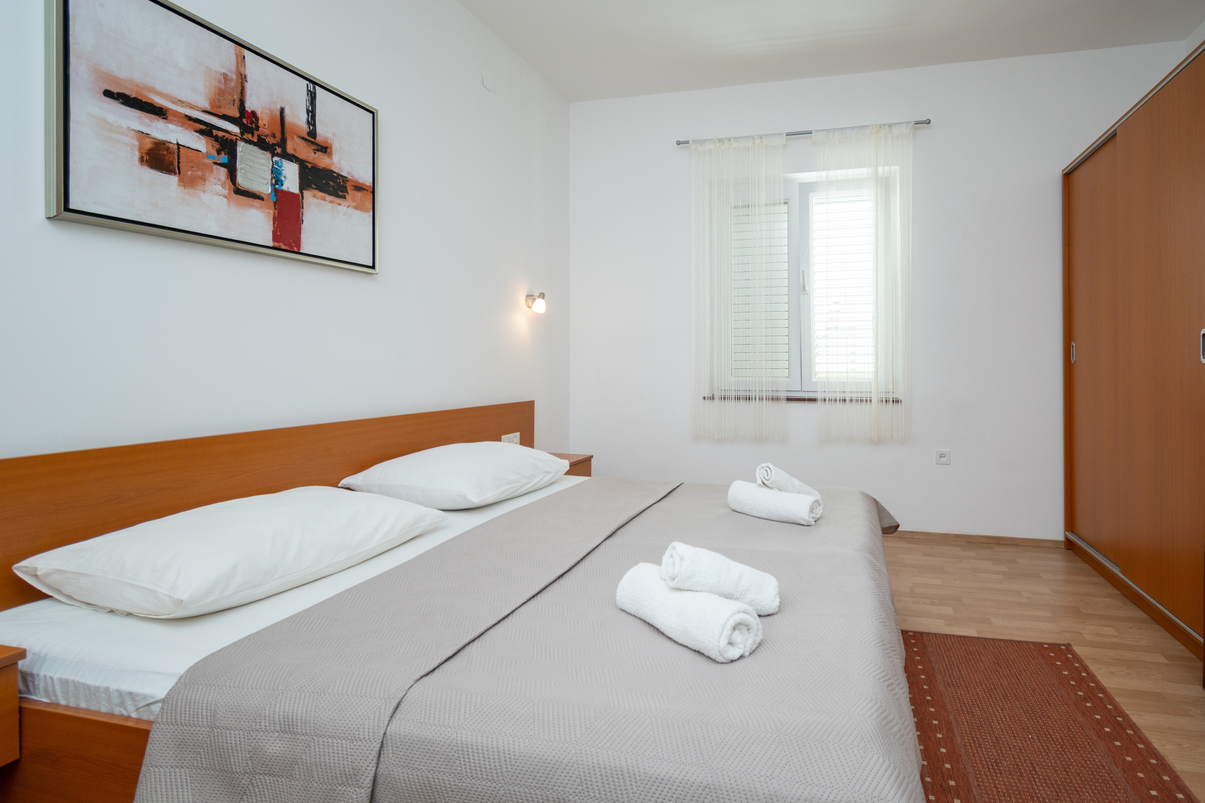 Apartament może przyjąć 3 gości. Łóżka znajdują się w sypialniach, których jest 1, na powierzchni 37m2. Goście mają dostęp do balkonu, by korzystać z ciepłych, letnich wieczorów. Z apartamentu roztacza się widok na morze. Możliwość przygotowywania posiłków poprzez korzystanie ze wspólnego grilla. W rezerwowanej kwaterze na miejscu jest pobierana kaucja (jej wysokość jest podana na stronie). WLICZONE W CENĘ: taksa pobytowa, sprzątanie końcowe, parking, internet. OBOWIĄZKOWE KOSZTY DODATKOWE: depozyt (150,00 € jednorazowo), dopłata za krótki termin (procent dopłaty w zalezności od liczby noclegów: 30% - 1, 20% - 2, 10% - 3). NIEOBOWIĄZKOWE KOSZTY DODATKOWE: klimatyzacja (10,00 € za nocleg). Dostępność dodatkowych usług w rezerwowanym terminie oraz ich cenę (jeśli nie jest podana) należy sprawdzić wcześniej. Za dodatowe usługi, które nie zostały uwzględnione w kalkulacji ceny, płaci się bezpośrednio właścicielowi obiektu, pod warunkiem śe gość korzysta z tych usług. Zniżki od ceny podstawowej: bezpłatny dzień 14=13 (przy pobycie, trwającym co najmniej 14 dni, otrzymujecie jeden bezpłatny dzień na pobyt do 31.12.2026).