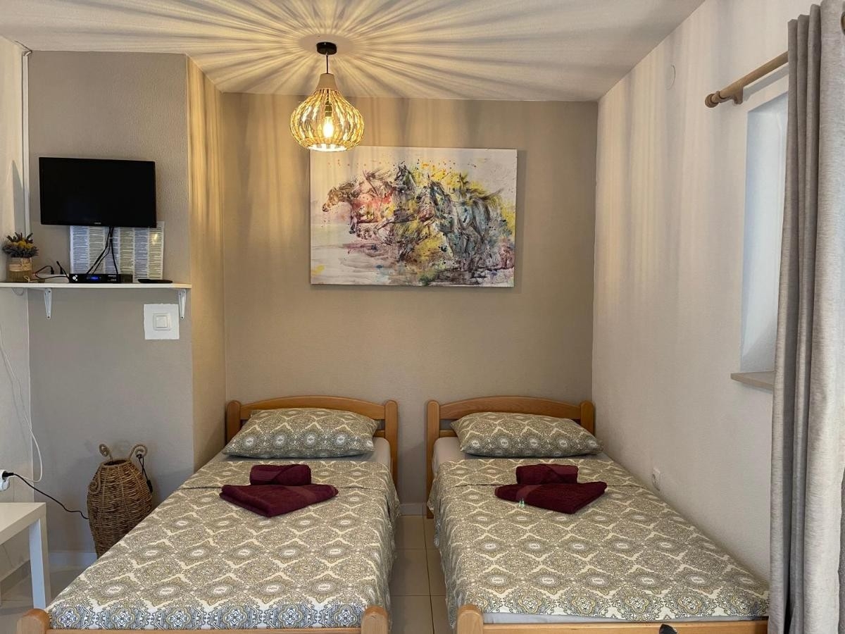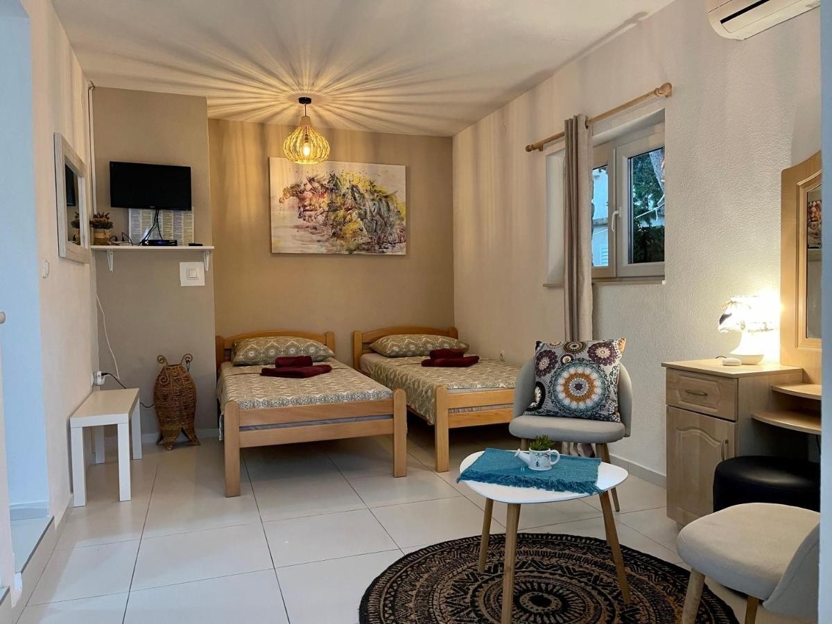Studio może przyjąć 2 gości. Łóżka znajdują się w sypialniach, których jest 1, na powierzchni 22m2. Goście mają dostęp do tarasu, by korzystać z ciepłych, letnich wieczorów. WLICZONE W CENĘ: taksa pobytowa, sprzątanie końcowe, klimatyzacja, parking, internet, żelazko, deska do prasowania, suszarka do włosów. Dostępność dodatkowych usług w rezerwowanym terminie oraz ich cenę (jeśli nie jest podana) należy sprawdzić wcześniej. Za dodatowe usługi, które nie zostały uwzględnione w kalkulacji ceny, płaci się bezpośrednio właścicielowi obiektu, pod warunkiem śe gość korzysta z tych usług. Zniżki od ceny podstawowej: bezpłatny dzień 14=13 (przy pobycie, trwającym co najmniej 14 dni, otrzymujecie jeden bezpłatny dzień na pobyt do 31.12.2026).