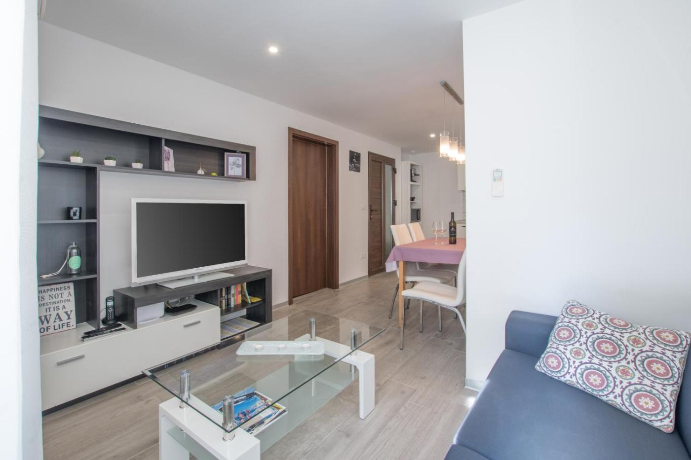 Oferta apartamentu obejmuje sypialnię (1), salon, kuchnię z pełnym wyposażeniem, w tym lodówką i ekspresem do kawy, a także łazienkę (1) z prysznicem oraz bezpłatnym zestawem kosmetyków. W apartamencie zapewniono ręczniki i pościel.