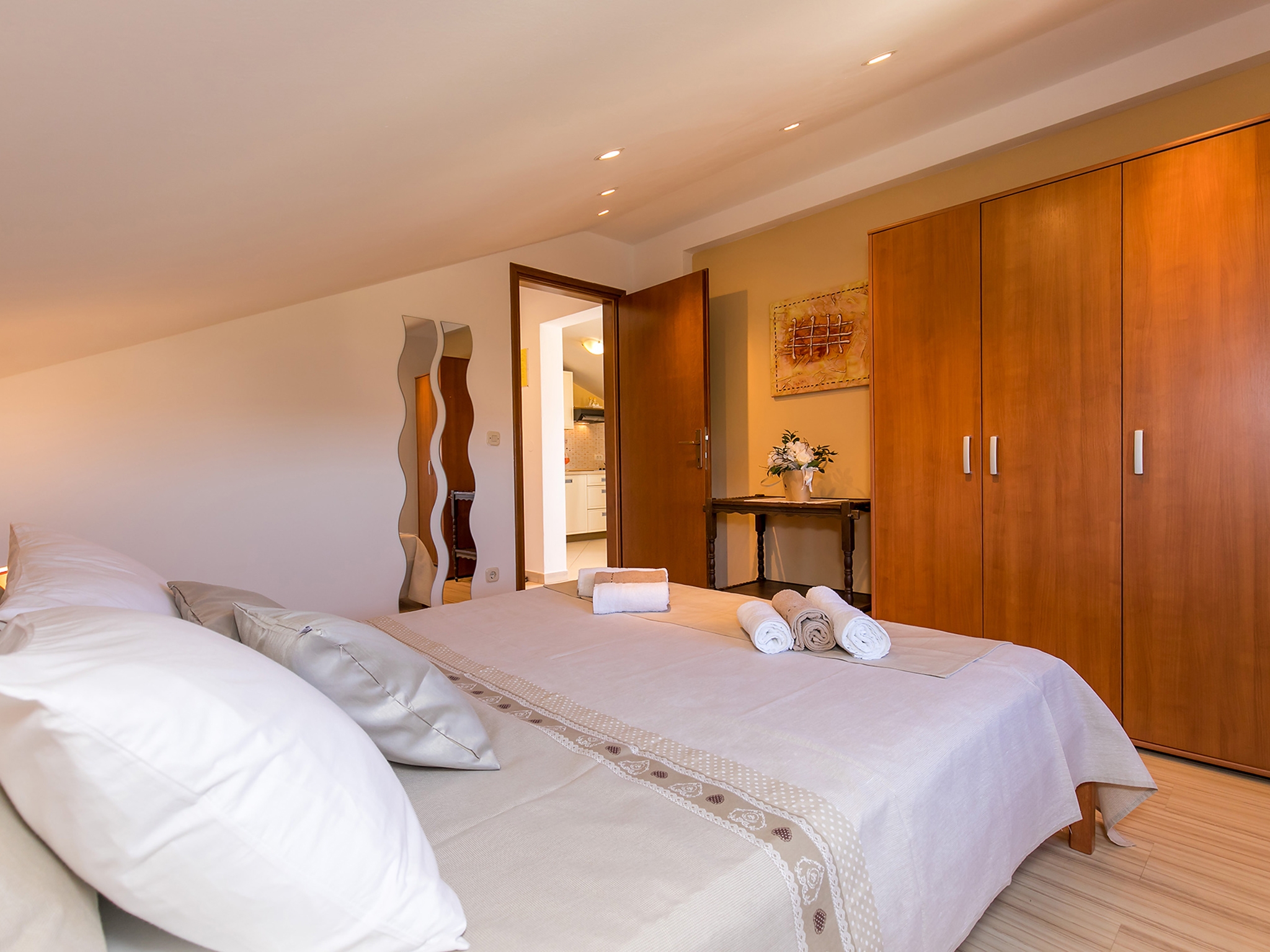Apartament może przyjąć 2 gości. Łóżka znajdują się w sypialniach, których jest 1, na powierzchni 44m2. Goście mają dostęp do tarasu, by korzystać z ciepłych, letnich wieczorów. Z apartamentu roztacza się widok na morze. WLICZONE W CENĘ: taksa pobytowa, sprzątanie końcowe, klimatyzacja, parking, internet, żelazko, deska do prasowania, suszarka do włosów. OBOWIĄZKOWE KOSZTY DODATKOWE: dopłata za krótki termin (procent dopłaty w zalezności od liczby noclegów: 30% - 1, 20% - 2, 10% - 3). Dostępność dodatkowych usług w rezerwowanym terminie oraz ich cenę (jeśli nie jest podana) należy sprawdzić wcześniej. Za dodatowe usługi, które nie zostały uwzględnione w kalkulacji ceny, płaci się bezpośrednio właścicielowi obiektu, pod warunkiem śe gość korzysta z tych usług.