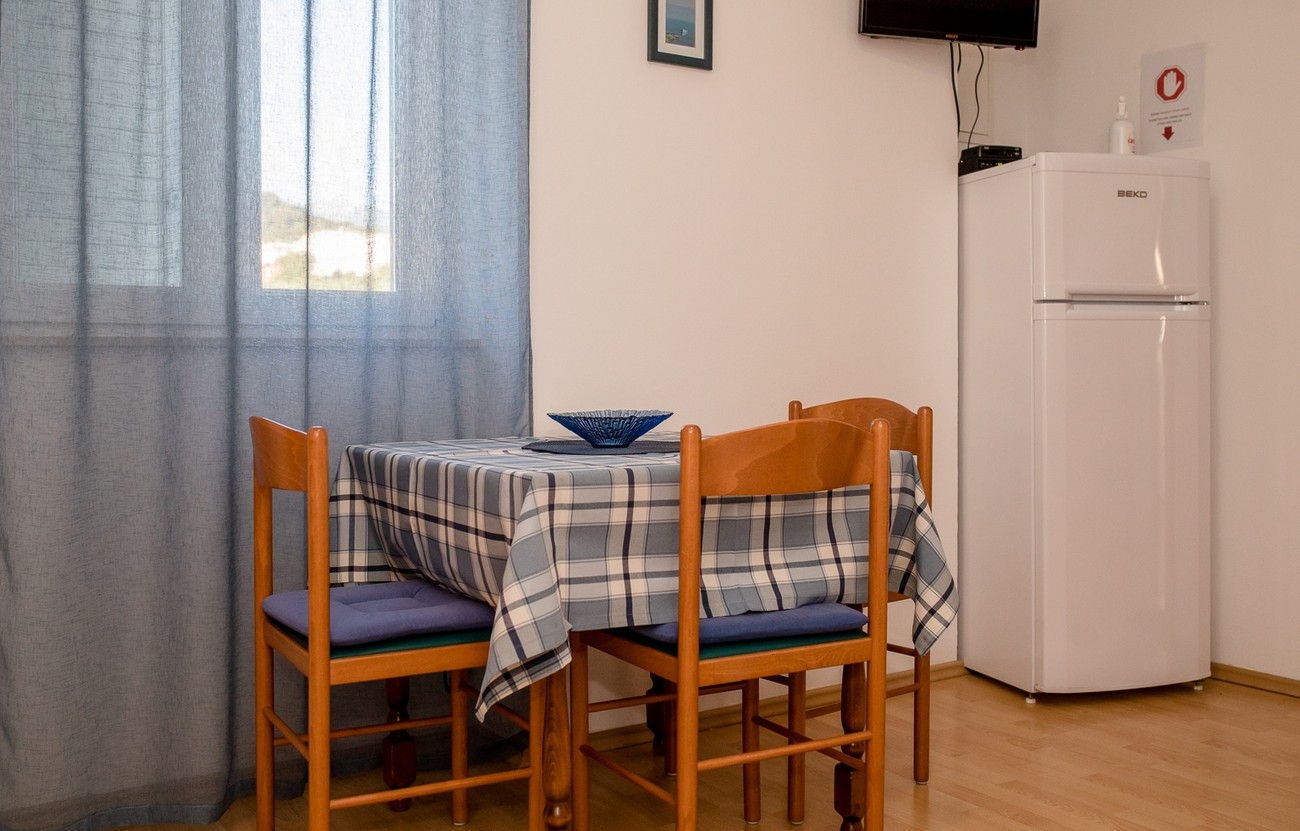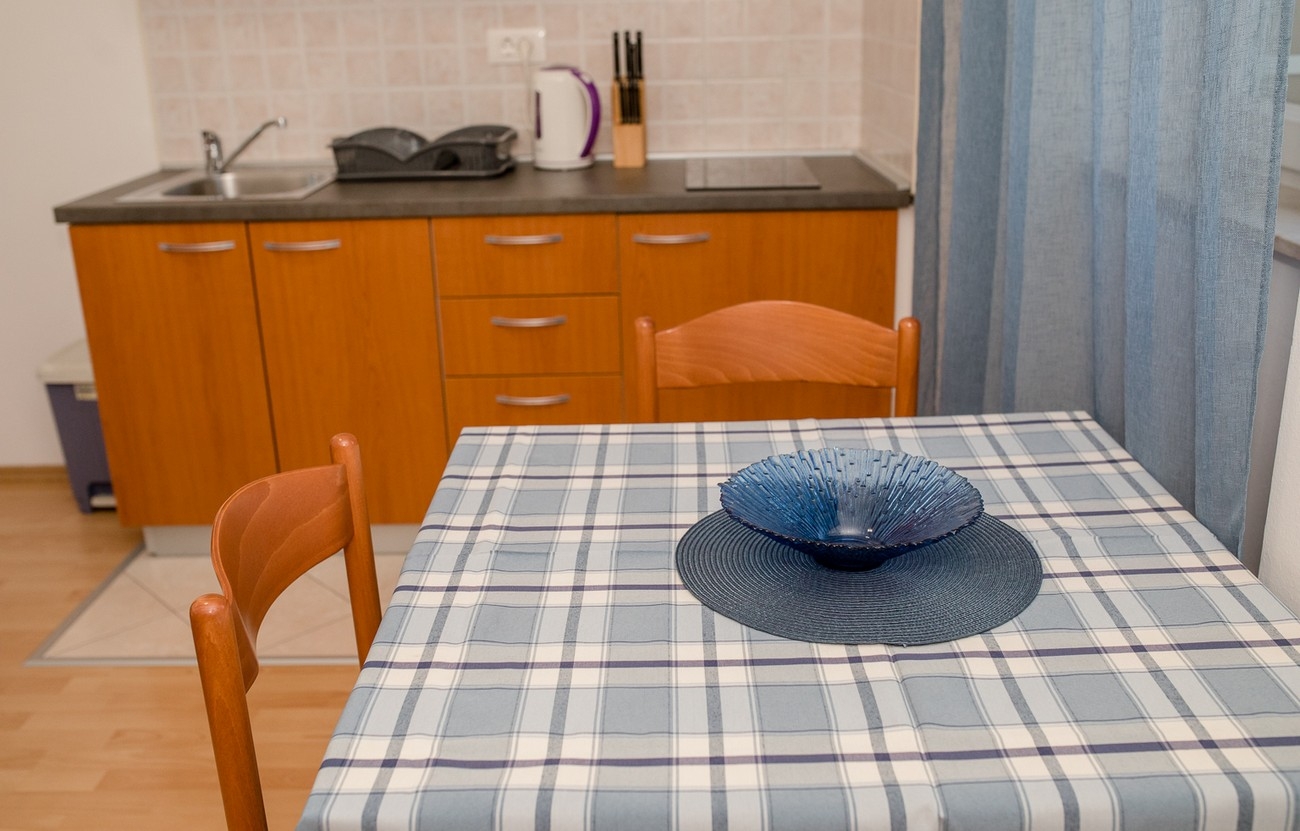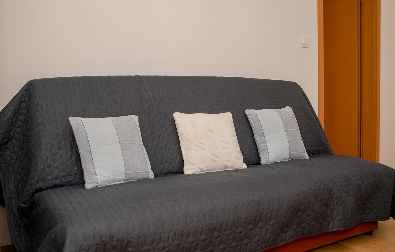 Apartament może przyjąć 3 gości. Łóżka znajdują się w sypialniach, których jest 1, oraz w pokoju dziennym, na powierzchni 29m2. Goście mają dostęp do tarasu, by korzystać z ciepłych, letnich wieczorów. Z apartamentu roztacza się widok na morze. Możliwość przygotowywania posiłków poprzez korzystanie ze wspólnego grilla. W kwaterze dozwolony jest pobyt zwierzęcia domowego, za dopłatą. WLICZONE W CENĘ: taksa pobytowa, sprzątanie końcowe, klimatyzacja, parking, internet. OBOWIĄZKOWE KOSZTY DODATKOWE: dopłata za krótki termin (procent dopłaty w zalezności od liczby noclegów: 30% - 1, 20% - 2, 10% - 3). NIEOBOWIĄZKOWE KOSZTY DODATKOWE: śniadanie (10,00 €, 50% zniżki dla dzieci od 4 do 12 lat, Bezpłatne dla dzieci do 4 lat), pranie bielizny (5,00 € pranie), miejsce do cumowania łodzi (5,00 € za nocleg), zwierzęta domowe (10,00 € za nocleg). Dostępność dodatkowych usług w rezerwowanym terminie oraz ich cenę (jeśli nie jest podana) należy sprawdzić wcześniej. Za dodatowe usługi, które nie zostały uwzględnione w kalkulacji ceny, płaci się bezpośrednio właścicielowi obiektu, pod warunkiem śe gość korzysta z tych usług.