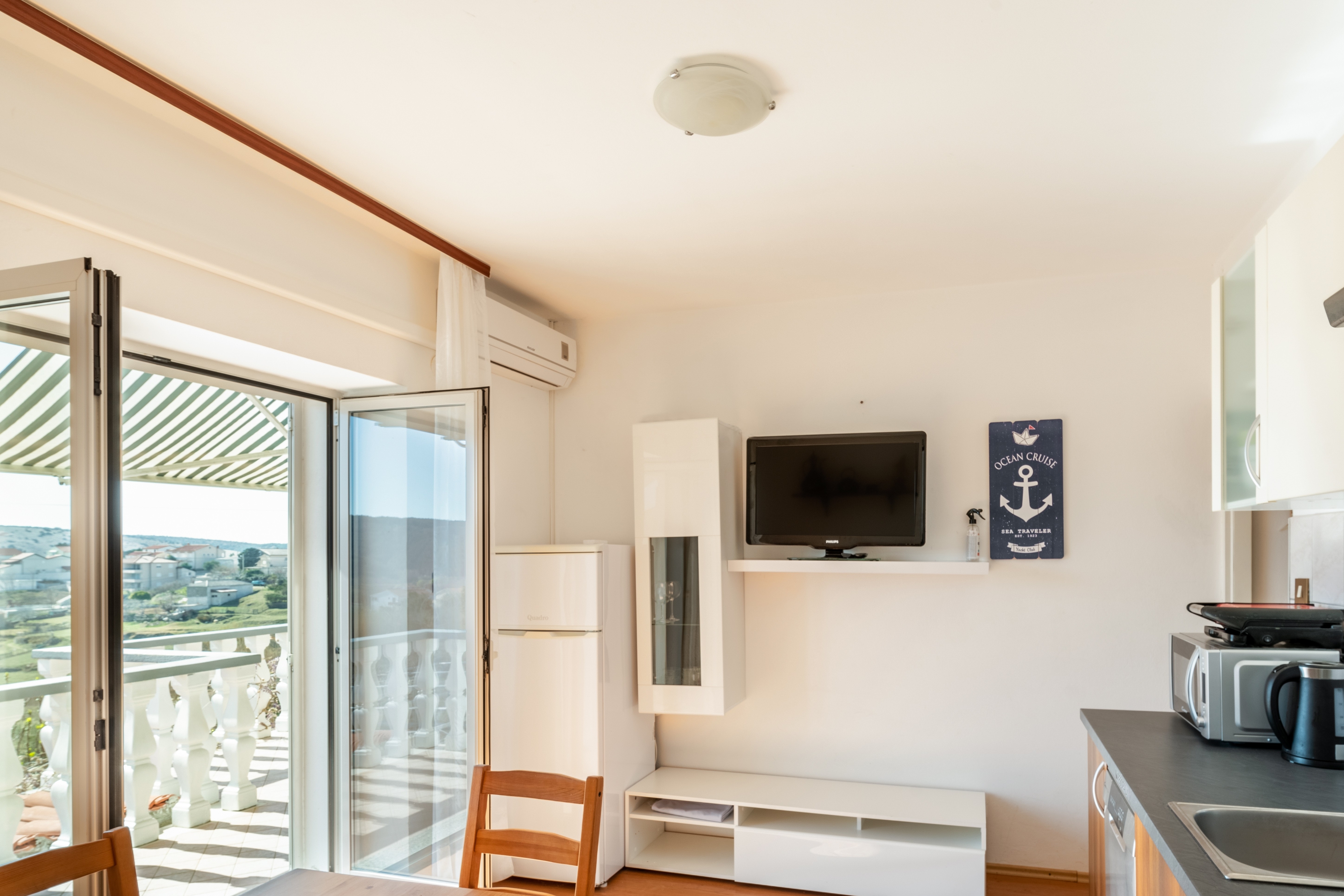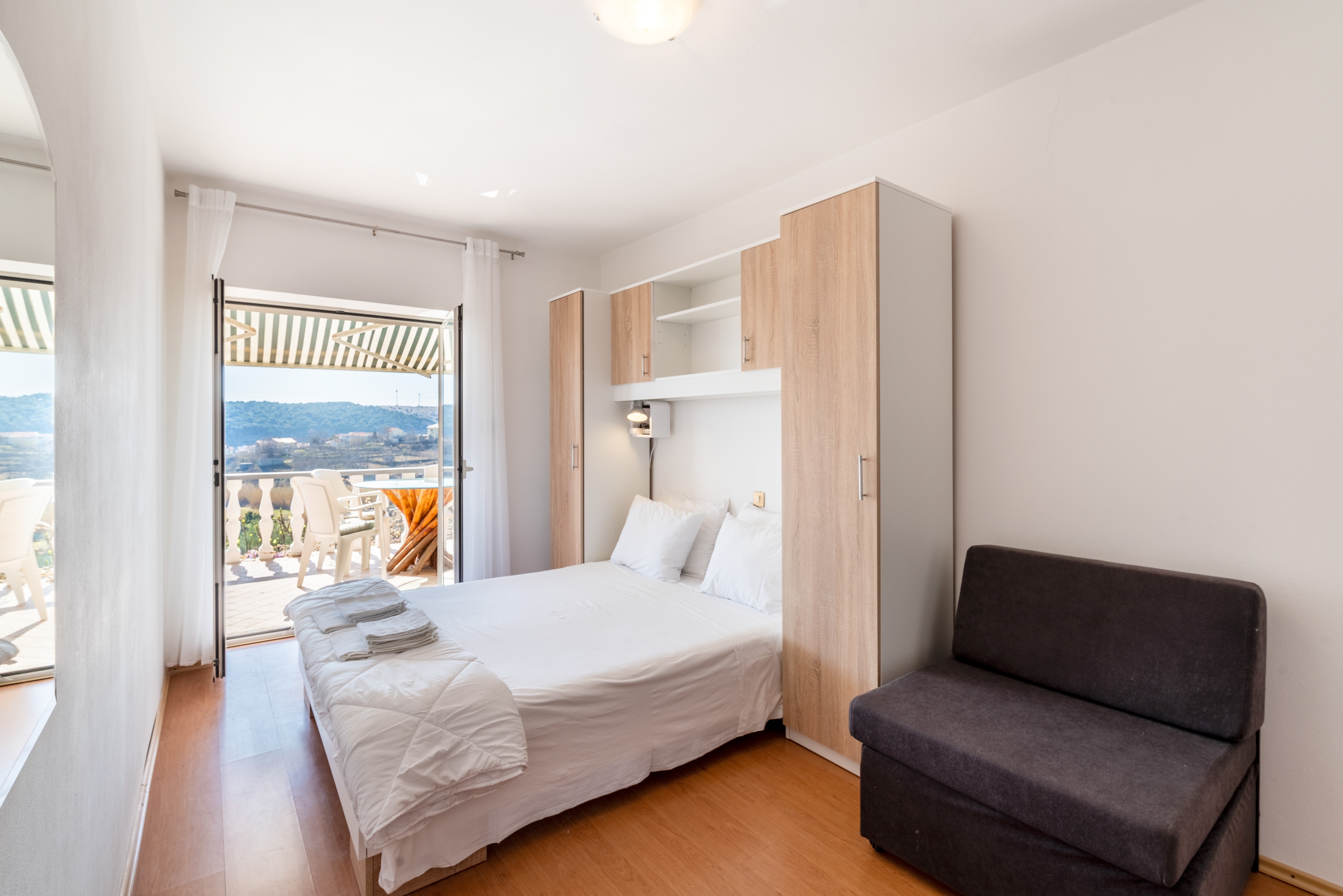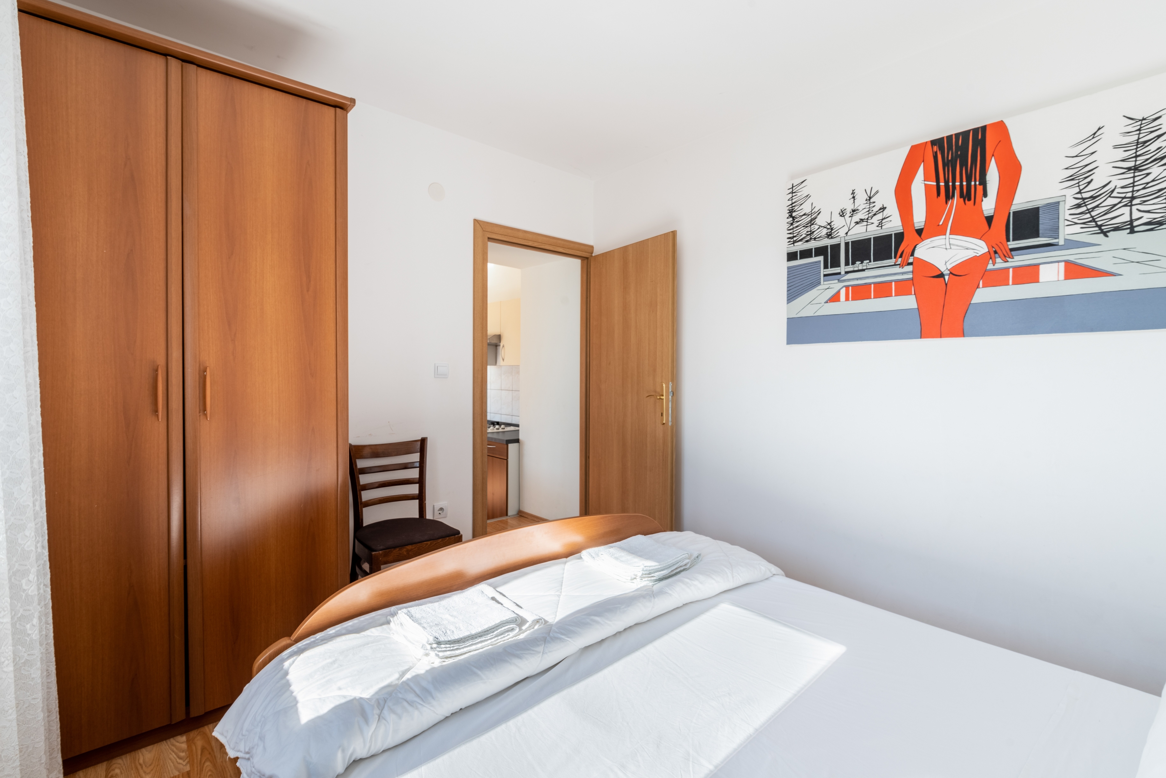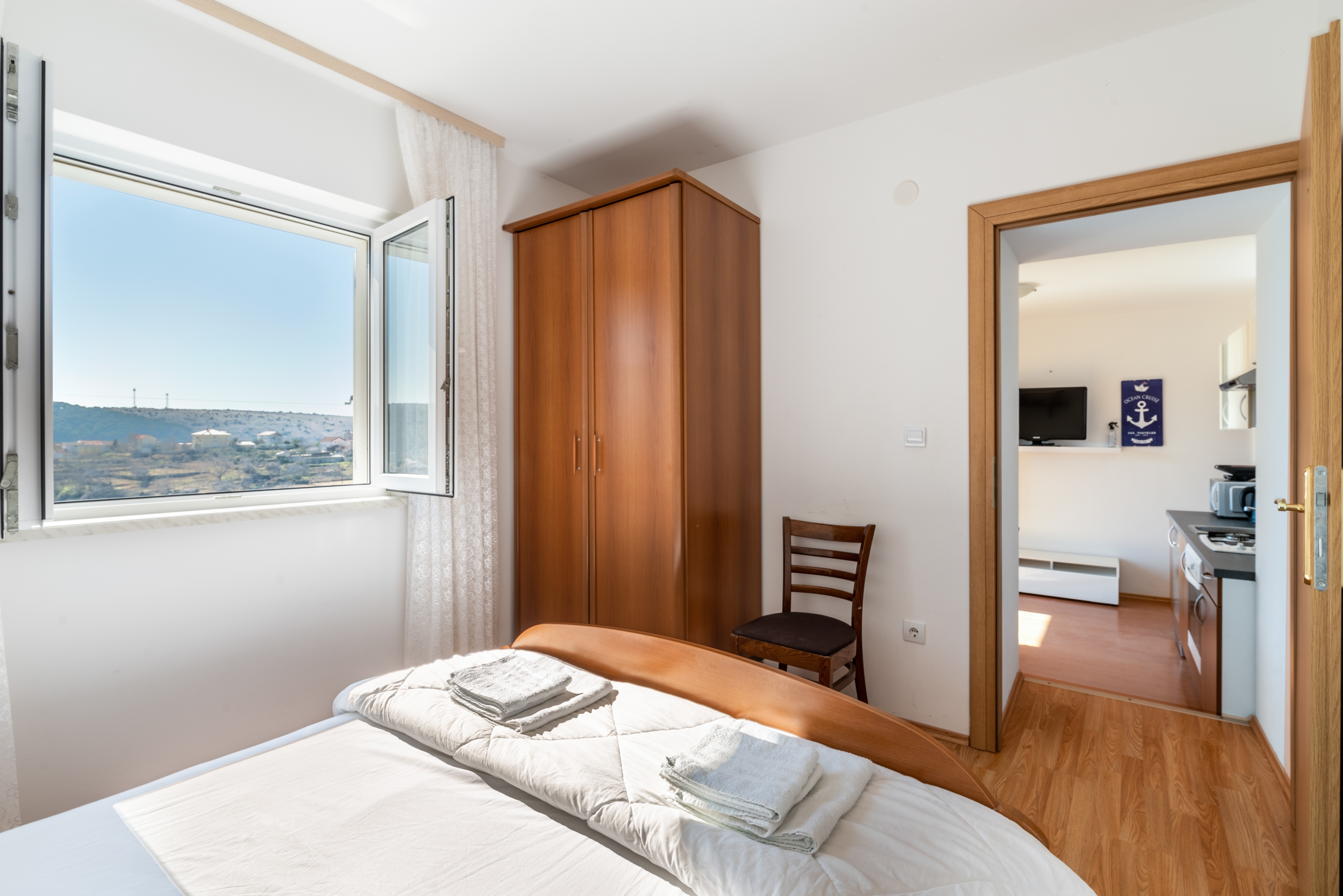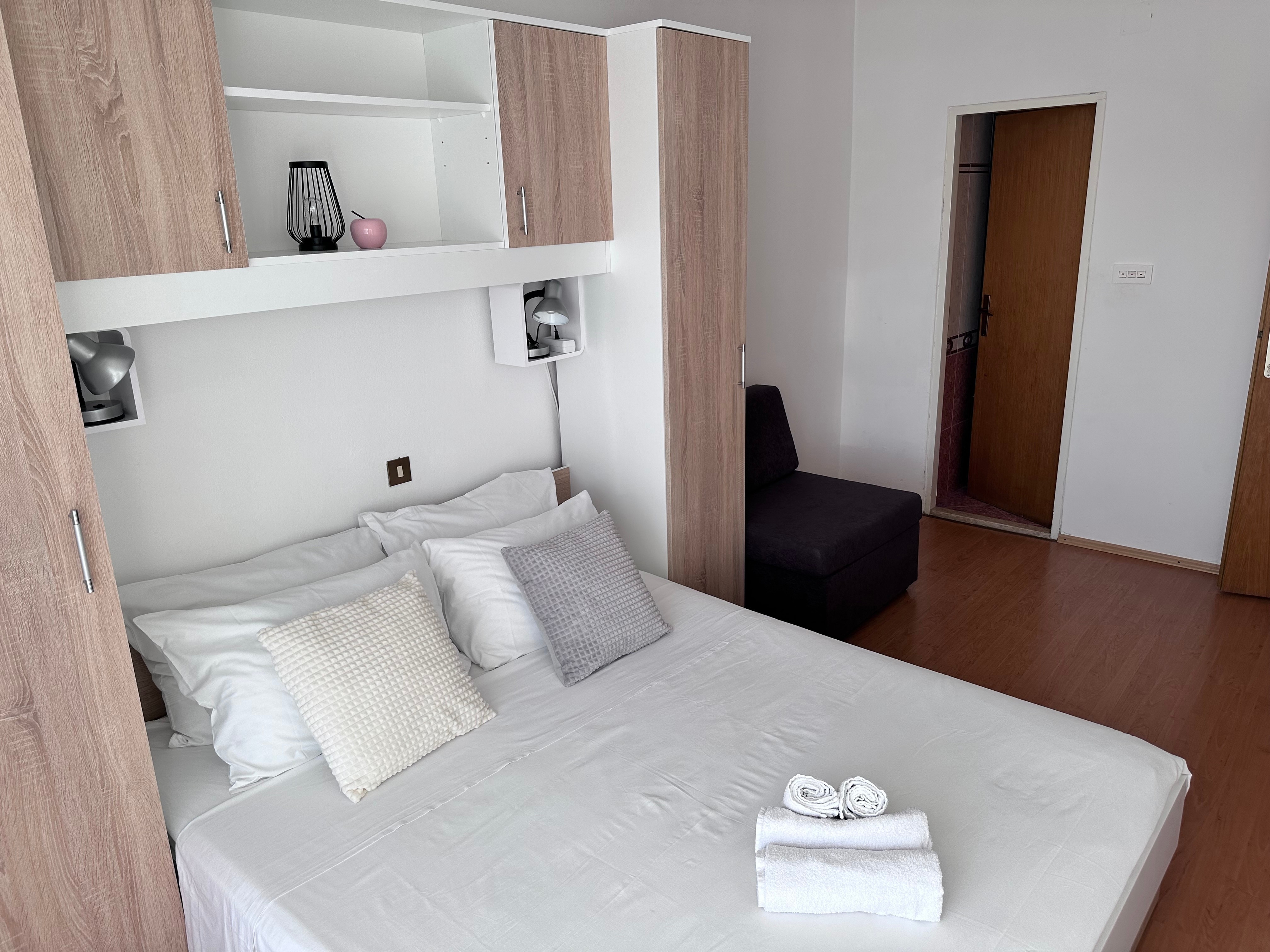 Apartament może przyjąć 5 gości. Łóżka znajdują się w sypialniach, których jest 2, na powierzchni 48m2. Goście mają dostęp do tarasu, by korzystać z ciepłych, letnich wieczorów. Możliwość przygotowywania posiłków poprzez korzystanie ze wspólnego grilla. W kwaterze dozwolony jest pobyt zwierzęcia domowego, za dopłatą. WLICZONE W CENĘ: taksa pobytowa, sprzątanie końcowe, klimatyzacja, parking, internet, żelazko, deska do prasowania, suszarka do włosów. OBOWIĄZKOWE KOSZTY DODATKOWE: dopłata za krótki termin (procent dopłaty w zalezności od liczby noclegów: 30% - 1, 20% - 2, 10% - 3). NIEOBOWIĄZKOWE KOSZTY DODATKOWE: zwierzęta domowe (20,00 € za nocleg). Dostępność dodatkowych usług w rezerwowanym terminie oraz ich cenę (jeśli nie jest podana) należy sprawdzić wcześniej. Za dodatowe usługi, które nie zostały uwzględnione w kalkulacji ceny, płaci się bezpośrednio właścicielowi obiektu, pod warunkiem śe gość korzysta z tych usług. Zniżki od ceny podstawowej: bezpłatny dzień 14=13 (przy pobycie, trwającym co najmniej 14 dni, otrzymujecie jeden bezpłatny dzień na pobyt do 31.12.2026).