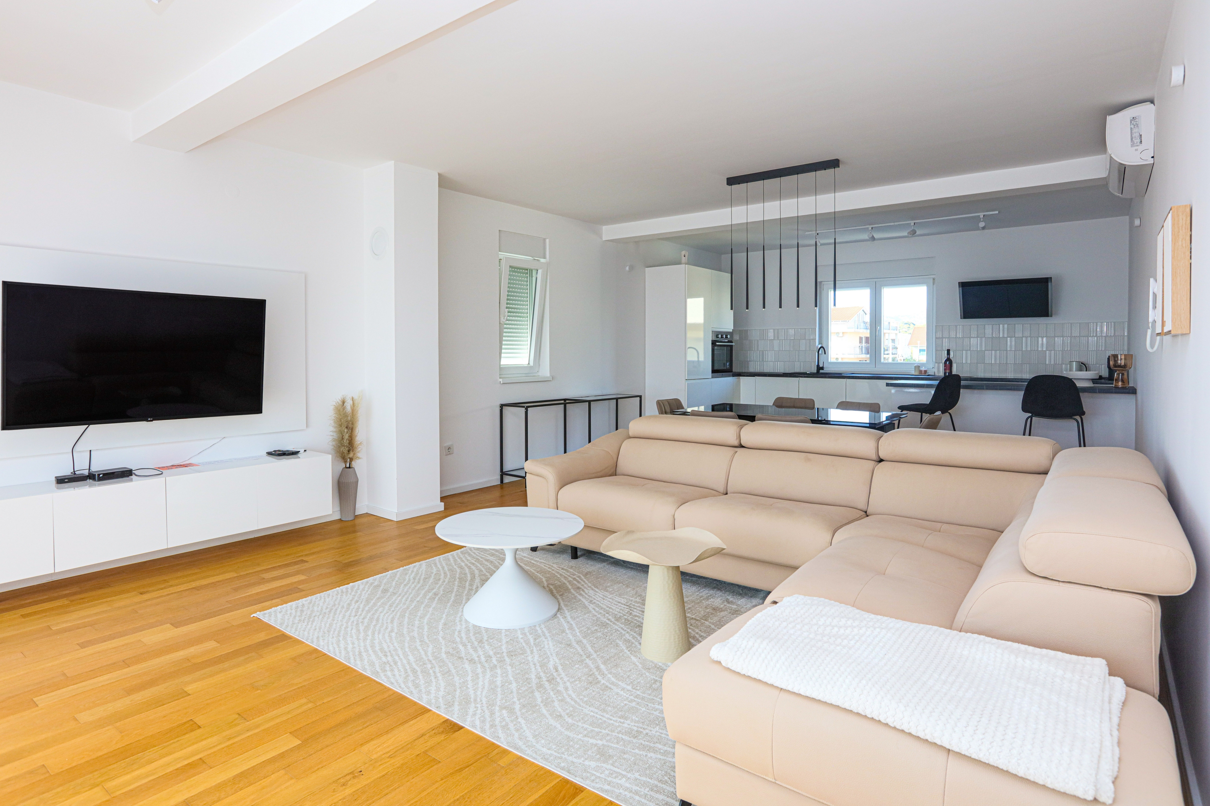 Apartament może przyjąć 6 gości. Łóżka znajdują się w sypialniach, których jest 2, oraz w pokoju dziennym, na powierzchni 88m2. Goście mają dostęp do balkonu, by korzystać z ciepłych, letnich wieczorów. Z apartamentu roztacza się widok na morze. WLICZONE W CENĘ: taksa pobytowa, sprzątanie końcowe, klimatyzacja, parking, internet, żelazko, deska do prasowania, suszarka do włosów. Dostępność dodatkowych usług w rezerwowanym terminie oraz ich cenę (jeśli nie jest podana) należy sprawdzić wcześniej. Za dodatowe usługi, które nie zostały uwzględnione w kalkulacji ceny, płaci się bezpośrednio właścicielowi obiektu, pod warunkiem śe gość korzysta z tych usług. Zniżki od ceny podstawowej: bezpłatny dzień 14=13 (przy pobycie, trwającym co najmniej 14 dni, otrzymujecie jeden bezpłatny dzień na pobyt do 31.12.2026).
