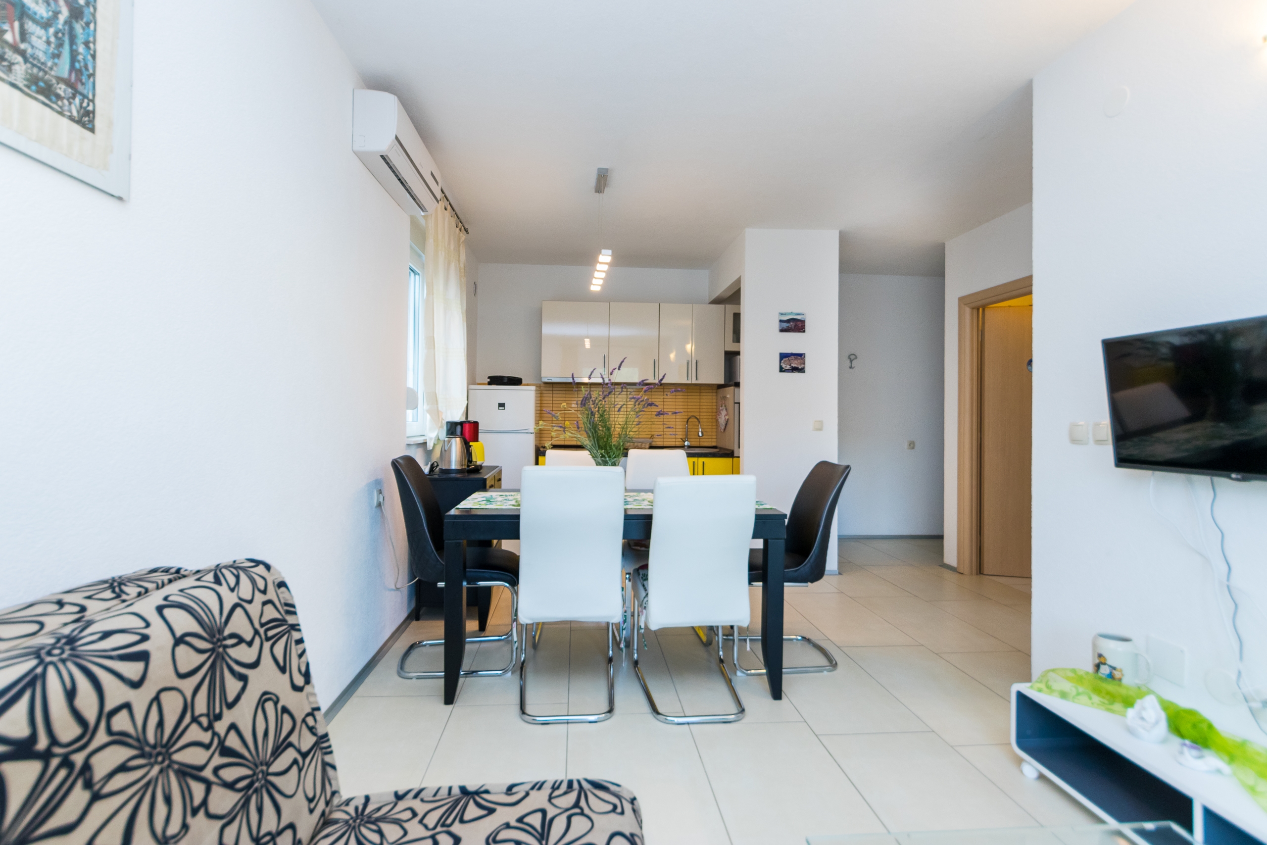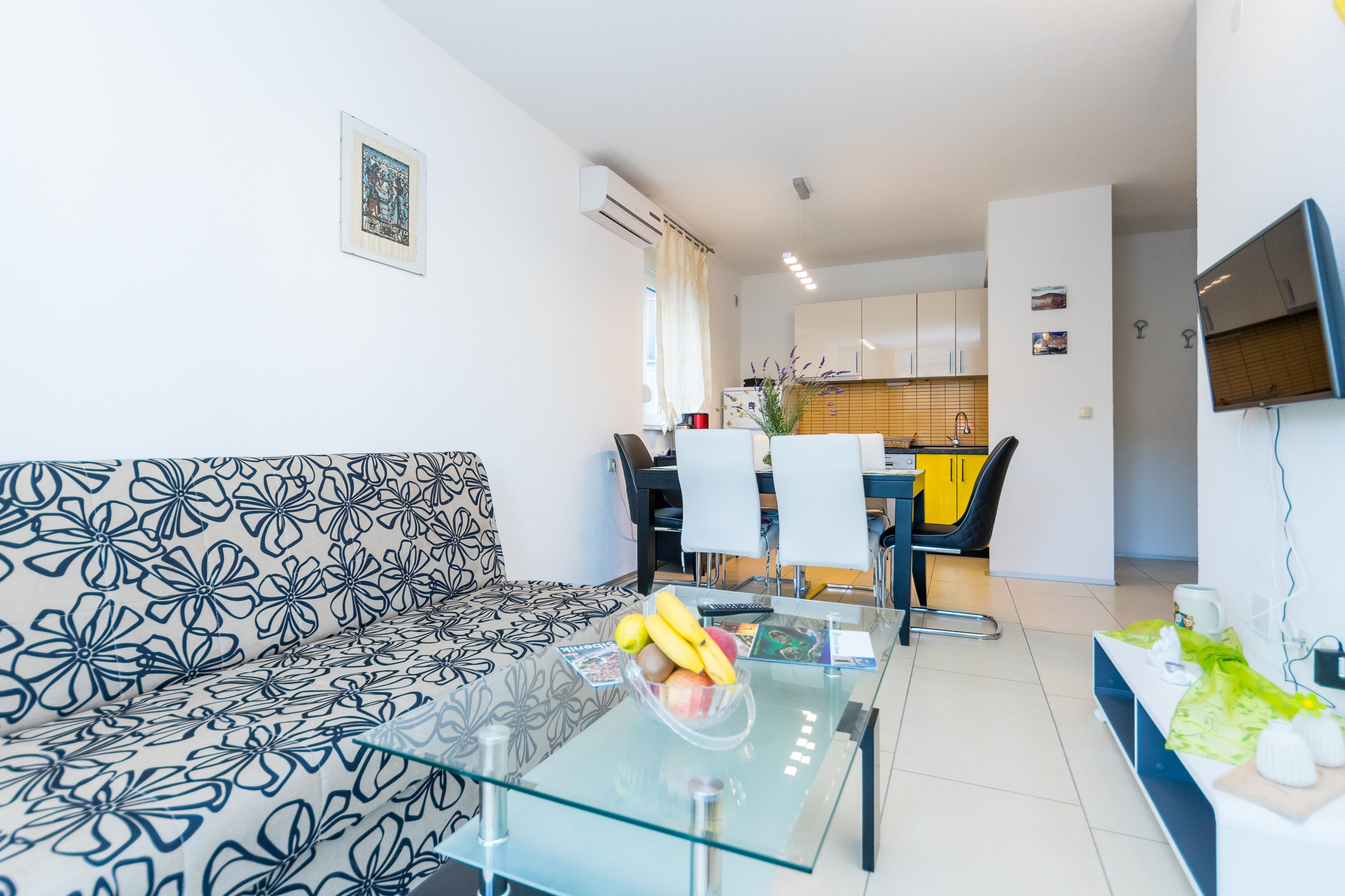 Apartament może przyjąć 4 gości. Łóżka znajdują się w sypialniach, których jest 1, oraz w pokoju dziennym, na powierzchni 34m2. Goście mają dostęp do tarasu, by korzystać z ciepłych, letnich wieczorów. Możliwość przygotowywania posiłków poprzez korzystanie ze wspólnego grilla. W kwaterze dozwolony jest pobyt zwierzęcia domowego, za dopłatą. WLICZONE W CENĘ: taksa pobytowa, sprzątanie końcowe, klimatyzacja, parking, internet, żelazko, deska do prasowania, suszarka do włosów, przenośny grill. OBOWIĄZKOWE KOSZTY DODATKOWE: dopłata za krótki termin (procent dopłaty w zalezności od liczby noclegów: 30% - 1, 20% - 2, 10% - 3). NIEOBOWIĄZKOWE KOSZTY DODATKOWE: pranie bielizny (5,00 € pranie), zwierzęta domowe (5,00 € za nocleg). Dostępność dodatkowych usług w rezerwowanym terminie oraz ich cenę (jeśli nie jest podana) należy sprawdzić wcześniej. Za dodatowe usługi, które nie zostały uwzględnione w kalkulacji ceny, płaci się bezpośrednio właścicielowi obiektu, pod warunkiem śe gość korzysta z tych usług. Zniżki od ceny podstawowej: bezpłatny dzień 14=13 (przy pobycie, trwającym co najmniej 14 dni, otrzymujecie jeden bezpłatny dzień na pobyt do 31.12.2026).
