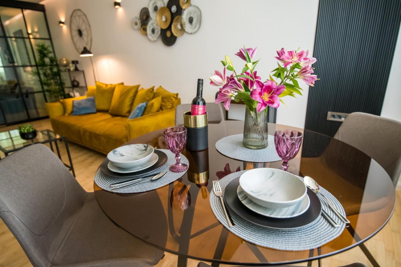 Apartament typu Deluxe. This spacious apartment is comprised of 1 living room, 1 separate bedroom and 1 bathroom with a walk-in shower and free toiletries. In the kitchen, guests will find a stovetop, a refrigerator, a dishwasher and kitchenware. The air-conditioned apartment offers a flat-screen TV with streaming services, a washing machine, a private entrance, soundproof walls as well as garden views. The unit offers 3 beds. Apartament - 4 osobowy. Powierzchnia pokoju ok.: 88 mkw.