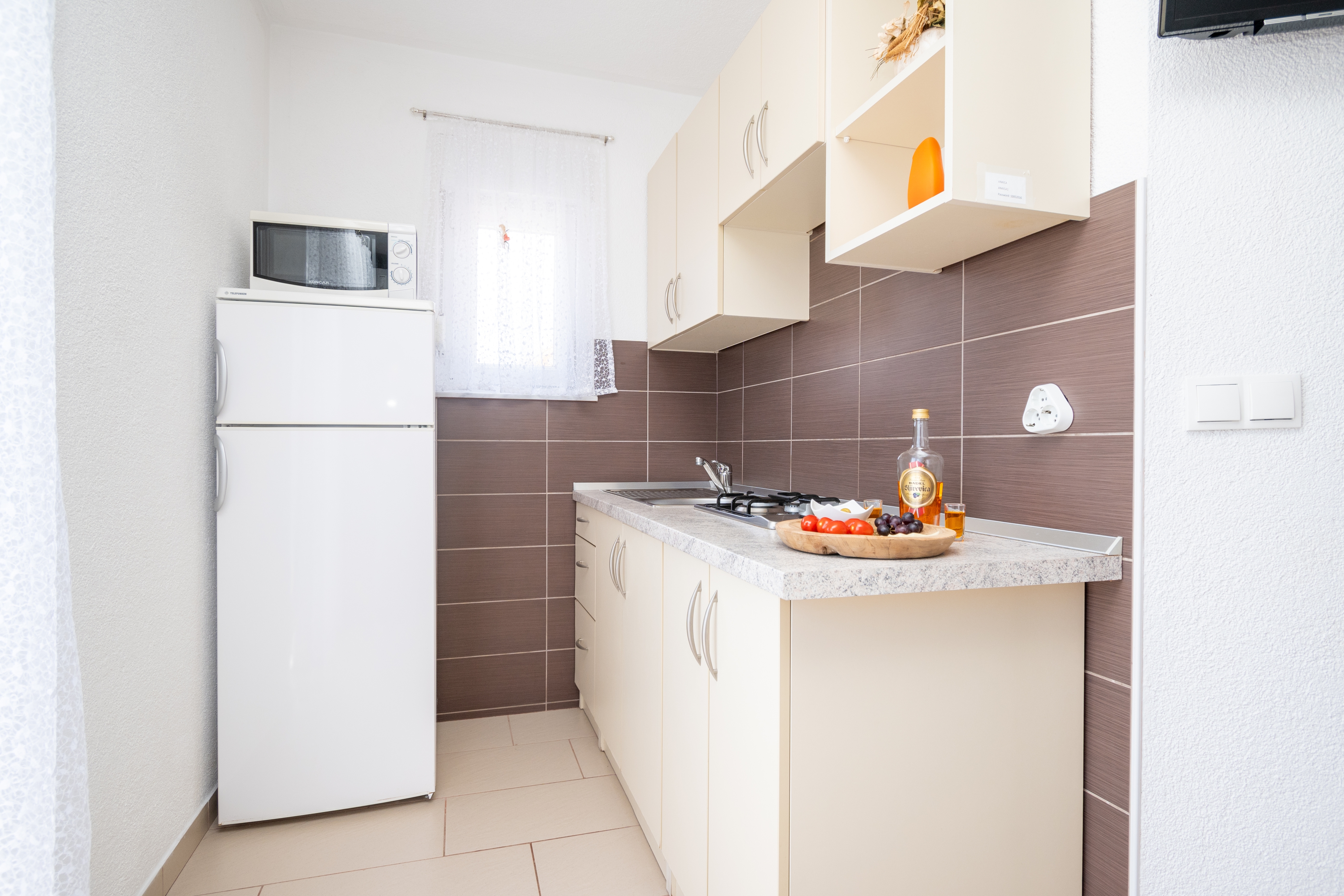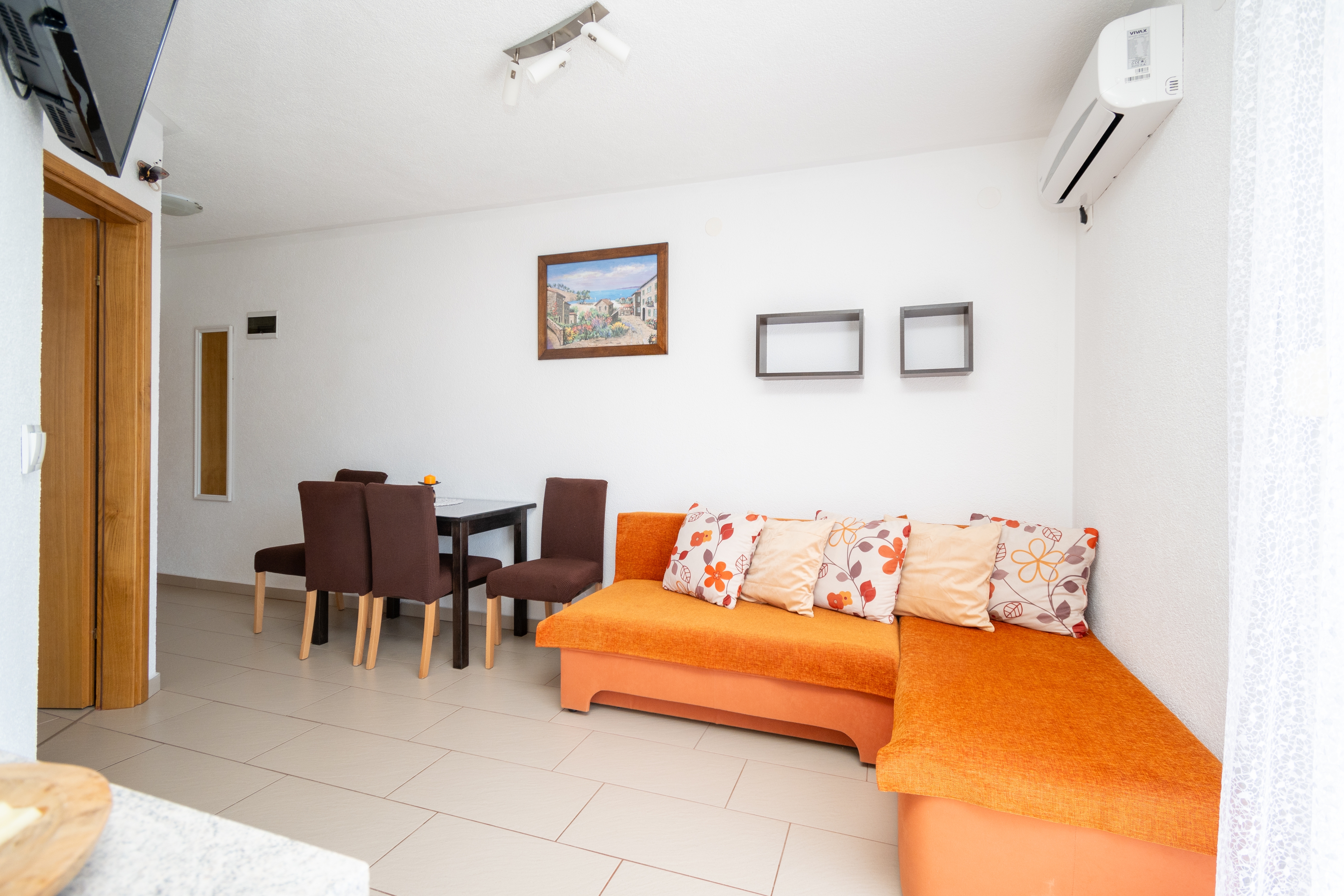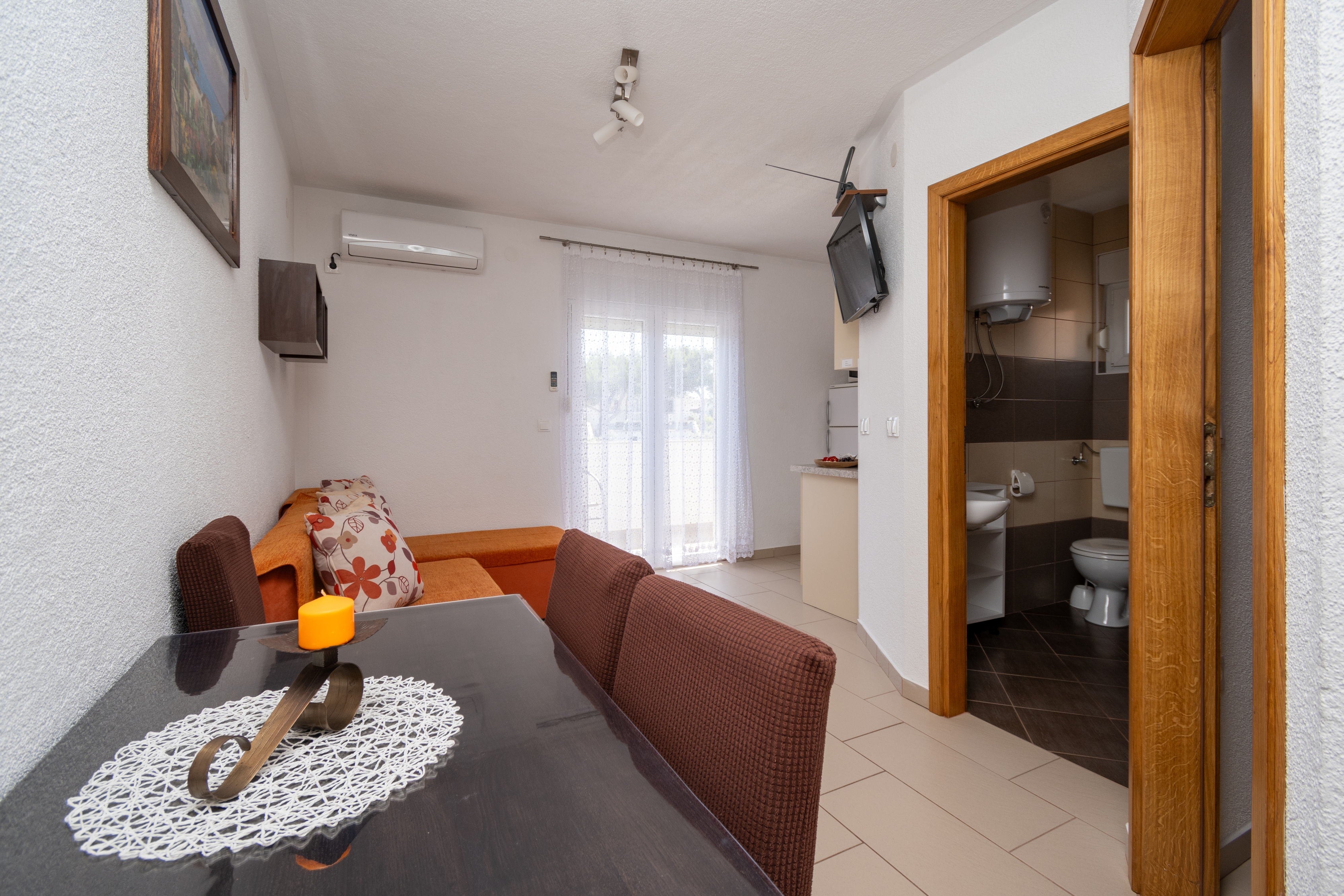 Apartament może przyjąć 3 gości. Łóżka znajdują się w sypialniach, których jest 1, oraz w pokoju dziennym, na powierzchni 32m2. Goście mają dostęp do balkonu, by korzystać z ciepłych, letnich wieczorów. Z apartamentu roztacza się widok na morze. Możliwość przygotowywania posiłków poprzez korzystanie ze wspólnego grilla. WLICZONE W CENĘ: taksa pobytowa, sprzątanie końcowe, klimatyzacja, parking, internet. OBOWIĄZKOWE KOSZTY DODATKOWE: dopłata za krótki termin (procent dopłaty w zalezności od liczby noclegów: 30% - 1, 20% - 2, 10% - 3). Dostępność dodatkowych usług w rezerwowanym terminie oraz ich cenę (jeśli nie jest podana) należy sprawdzić wcześniej. Za dodatowe usługi, które nie zostały uwzględnione w kalkulacji ceny, płaci się bezpośrednio właścicielowi obiektu, pod warunkiem śe gość korzysta z tych usług.