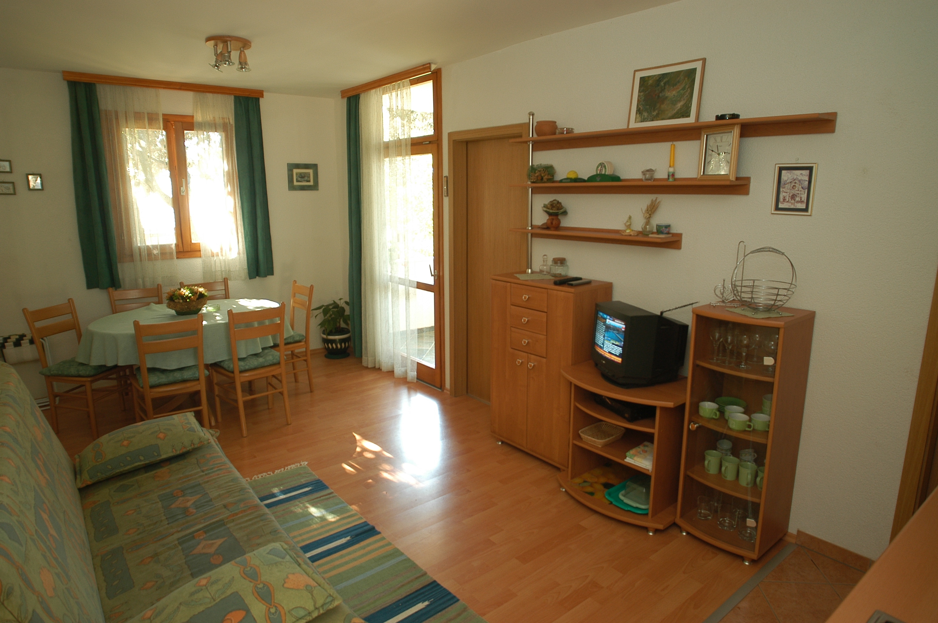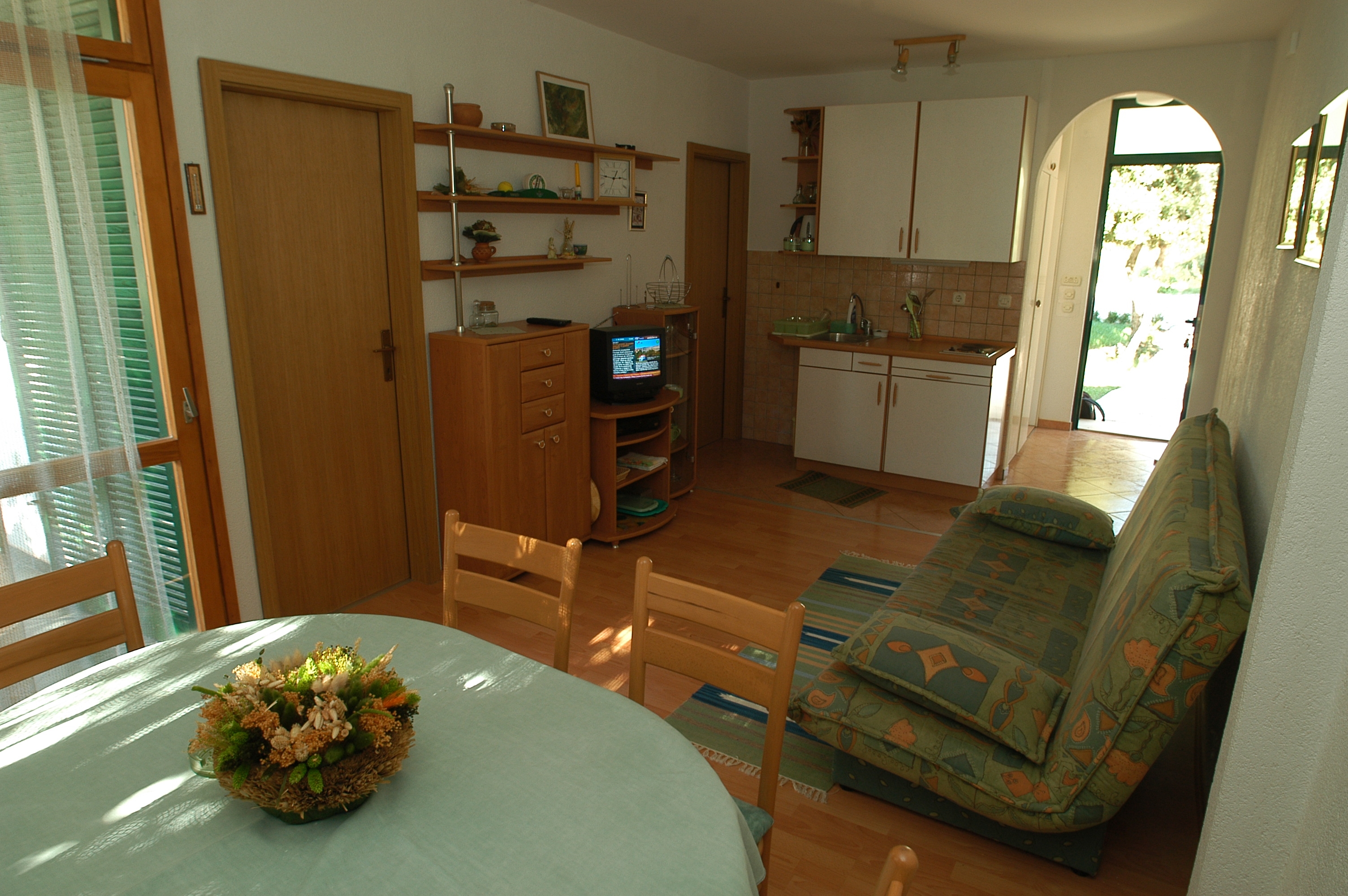 Apartament może przyjąć 6 gości. Łóżka znajdują się w sypialniach, których jest 2, oraz w pokoju dziennym, na powierzchni 39m2. Goście mają dostęp do tarasu, by korzystać z ciepłych, letnich wieczorów. Możliwość przygotowywania posiłków poprzez korzystanie ze wspólnego grilla. WLICZONE W CENĘ: taksa pobytowa, sprzątanie końcowe, klimatyzacja, internet, łóżeczko dziecięce, żelazko, deska do prasowania, suszarka do włosów. NIEOBOWIĄZKOWE KOSZTY DODATKOWE: pranie bielizny (5,00 € pranie). Dostępność dodatkowych usług w rezerwowanym terminie oraz ich cenę (jeśli nie jest podana) należy sprawdzić wcześniej. Za dodatowe usługi, które nie zostały uwzględnione w kalkulacji ceny, płaci się bezpośrednio właścicielowi obiektu, pod warunkiem śe gość korzysta z tych usług.