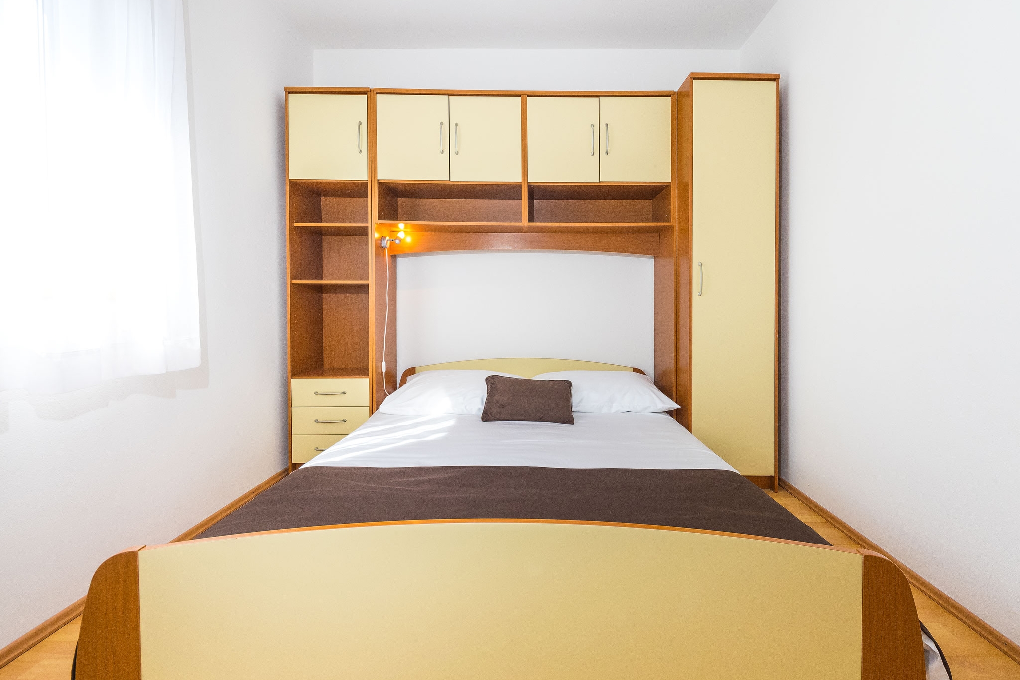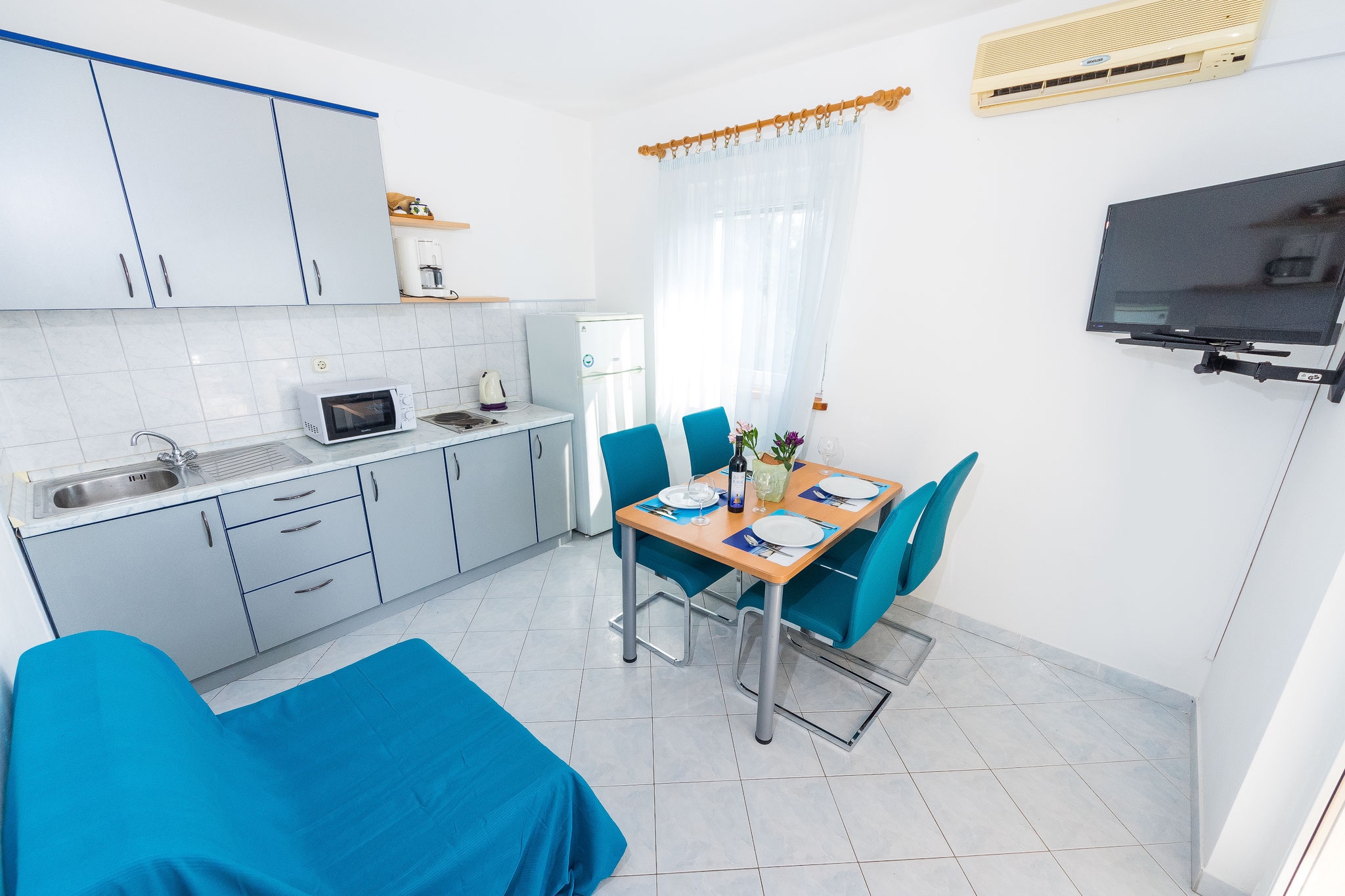 Apartament może przyjąć 4 gości. Łóżka znajdują się w sypialniach, których jest 2, na powierzchni 37m2. Goście mają dostęp do tarasu, by korzystać z ciepłych, letnich wieczorów. Z apartamentu roztacza się widok na morze. Możliwość przygotowywania posiłków poprzez korzystanie ze wspólnego grilla. WLICZONE W CENĘ: taksa pobytowa, sprzątanie końcowe, klimatyzacja, parking, internet, pranie bielizny, łóżeczko dziecięce, żelazko, deska do prasowania, suszarka do włosów, parasol, leżaki. OBOWIĄZKOWE KOSZTY DODATKOWE: dopłata za krótki termin (procent dopłaty w zalezności od liczby noclegów: 30% - 1, 20% - 2, 10% - 3). NIEOBOWIĄZKOWE KOSZTY DODATKOWE: dostawka (8,00 € za nocleg). Dostępność dodatkowych usług w rezerwowanym terminie oraz ich cenę (jeśli nie jest podana) należy sprawdzić wcześniej. Za dodatowe usługi, które nie zostały uwzględnione w kalkulacji ceny, płaci się bezpośrednio właścicielowi obiektu, pod warunkiem śe gość korzysta z tych usług.
