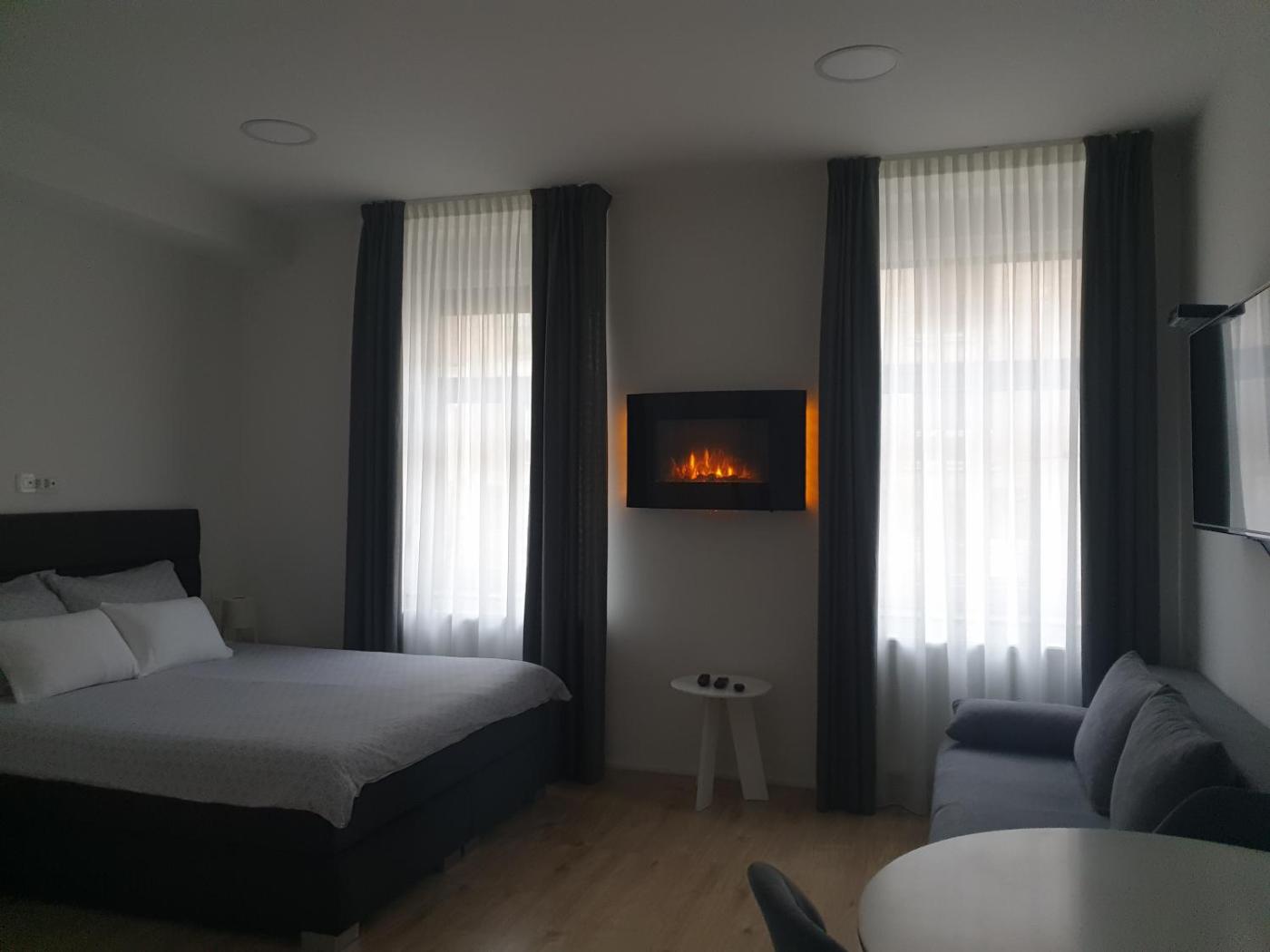 Studio. This studio offers a fireplace. Providing free toiletries and bathrobes, this studio includes a private bathroom with a walk-in shower, a hairdryer and slippers. Meals can be prepared in the well-fitted kitchen, which comes with a stovetop, a refrigerator, a dishwasher and kitchenware. The air-conditioned studio provides a flat-screen TV with streaming services, soundproof walls, a tea and coffee maker, a wardrobe as well as city views. The unit offers 2 beds. Studio - 4 osobowy. Powierzchnia pokoju ok.: 27 mkw. ;