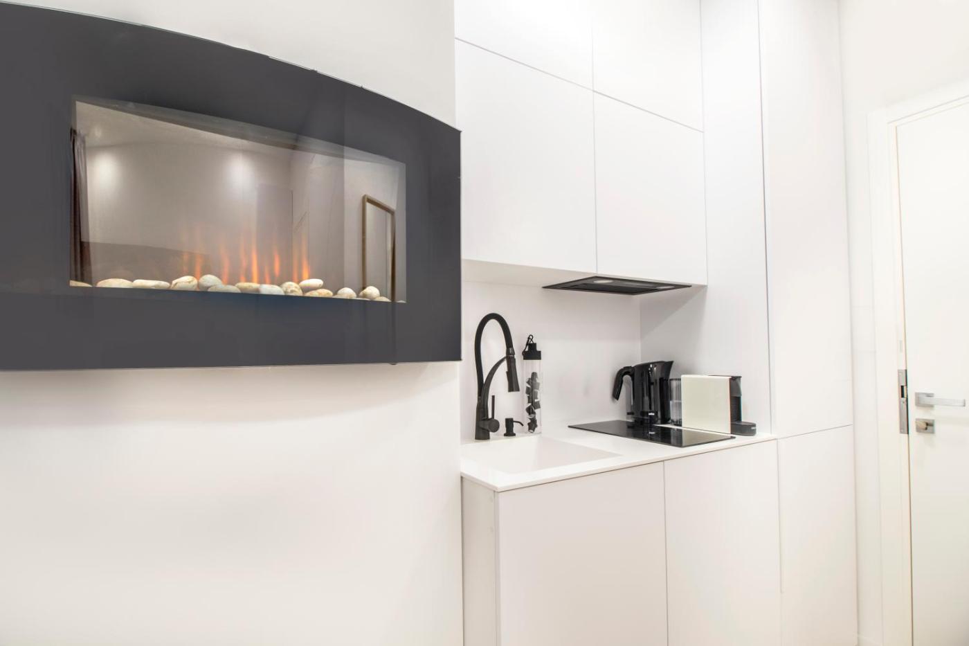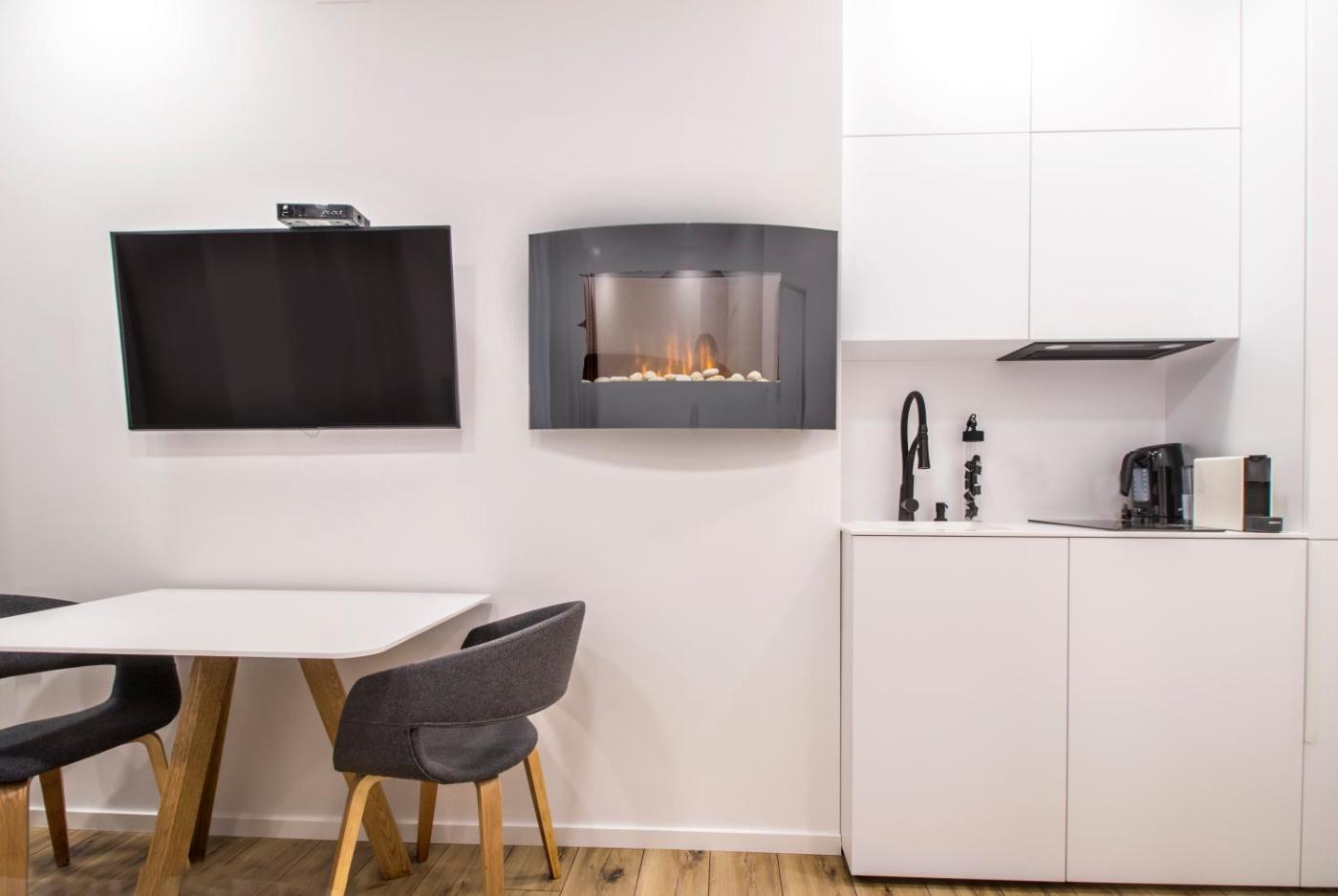 Apartament typu studio. The fireplace is the standout feature of this apartment. Boasting a private entrance, this air-conditioned apartment includes a kitchen, 1 bedroom and 1 bathroom with a walk-in shower and a hairdryer. In the fully equipped kitchen, guests will find a stovetop, a refrigerator, a dishwasher and kitchenware. The apartment offers a washing machine, soundproof walls, a tea and coffee maker, a flat-screen TV with streaming services, as well as ancourtyard view. The unit has 1 bed. Apartament - 2 osobowy. Powierzchnia pokoju ok.: 22 mkw.